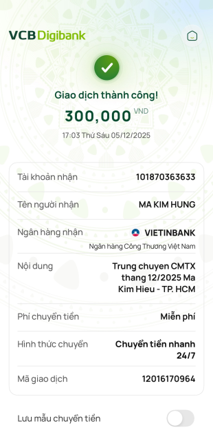 HBL đã nhận được 3tr bạn gửi CMTX T8,9,10,11,12/2025 cho hc này. HBL sẽ đến trao trong T12 này nhé !