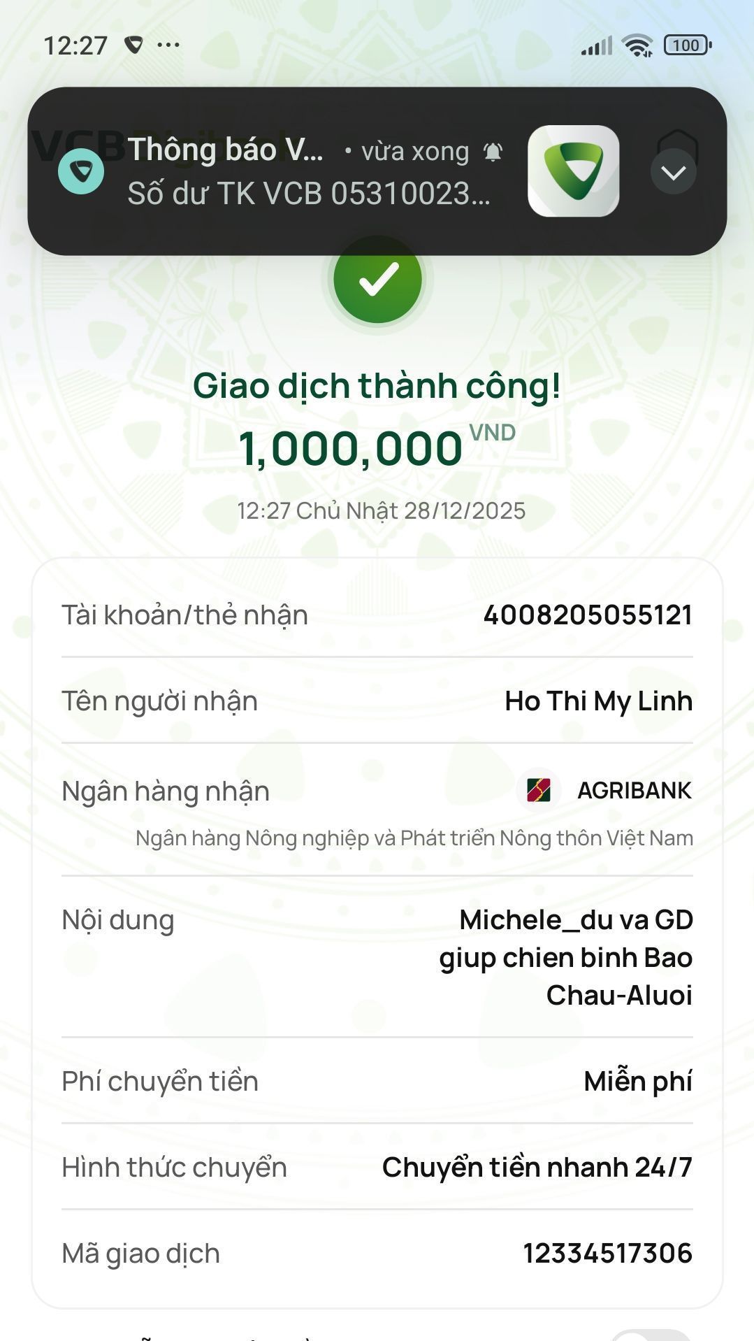 Michele_du và Gia đình ủng hộ Bảo Châu 1,000,000₫ và đã chuyển tiền trực tiếp cho mẹ Bảo Châu rồi.