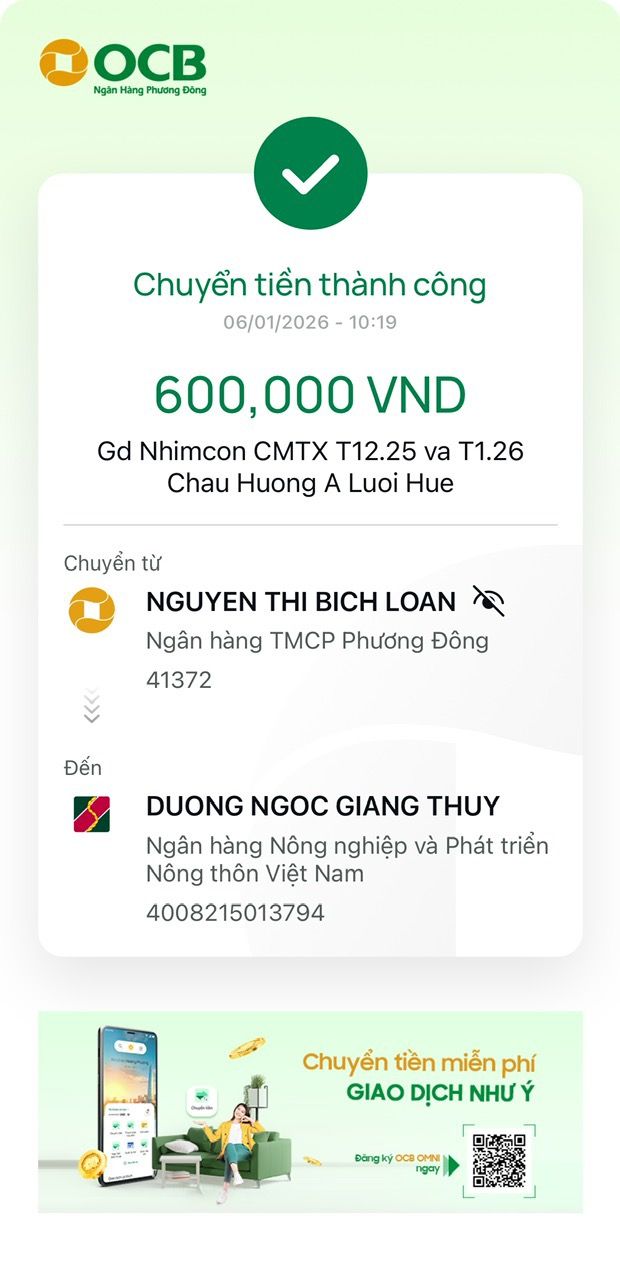 Tieuhuongduong đã nhận 2 triệu và đã hoàn thành chuyển CMTX của Whoadung đến các cháu từ tháng 7/2025 - tháng 01/2026 (7 tháng).