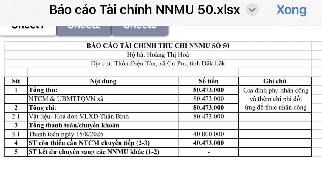 Về kinh phí NTCM đã chuyển đợt 1 40triệu đồng, số tiền còn thiếu là 40.473.000đ. Mong BQT chuyển số tiền còn lại để thanh toan nốt cho bên cung ứng VLXD ạ.