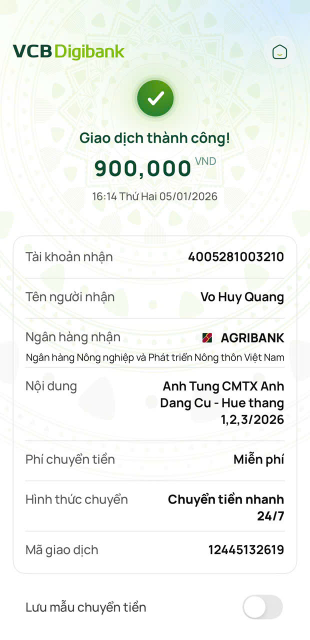 Tieuhuongduong chuyển khoản 3 tháng 1,2,3/2026, nhờ bạn @Huy Quang Võ trung chuyển giúp nhé.