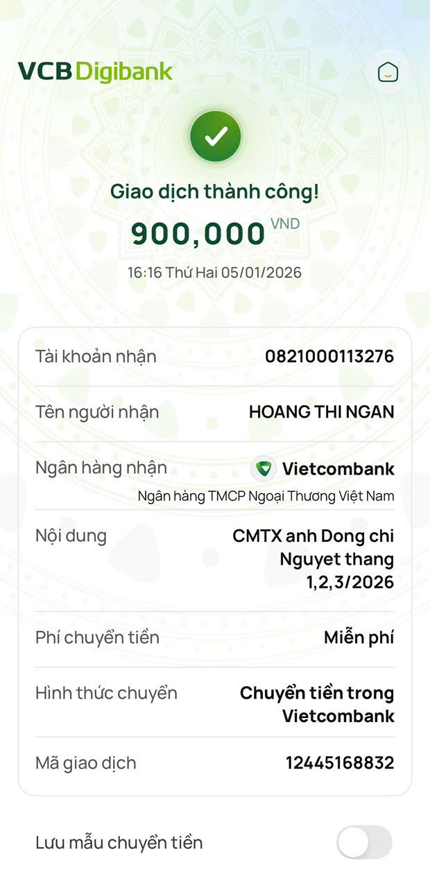 Tieuhuongduong chuyển 900,000đ CMTX 3 tháng 1,2.3/2026. Nhờ bạn @Hoàng Ngân trung chuyển đến gia đình anh Đông chị Nguyệt nhé.
