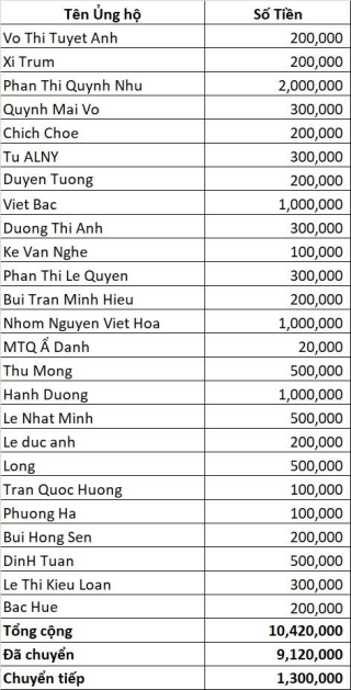 Vịt tổng hợp ủng hộ ông Nghiêm đến hôm nay là 10.420.000đ, đã chuyển 9.120.000đ, anh Banbe6x điều phối số tiền 1.300.000đ còn lại nha.