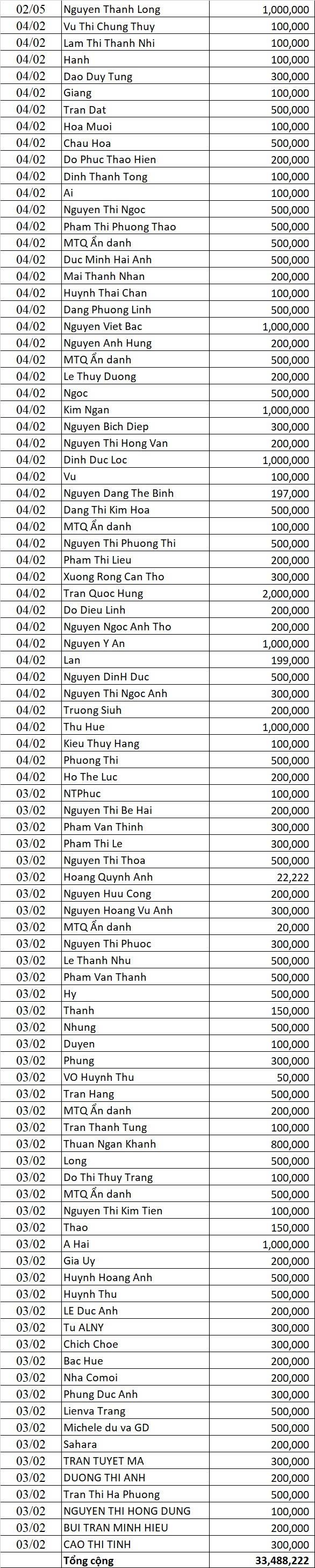 Vịt gửi thống kê ủng hộ bà Ma đến hôm nay 33.488.222, đã chuyển 5.600.000đ, nhờ anh 6x điều phối ah.