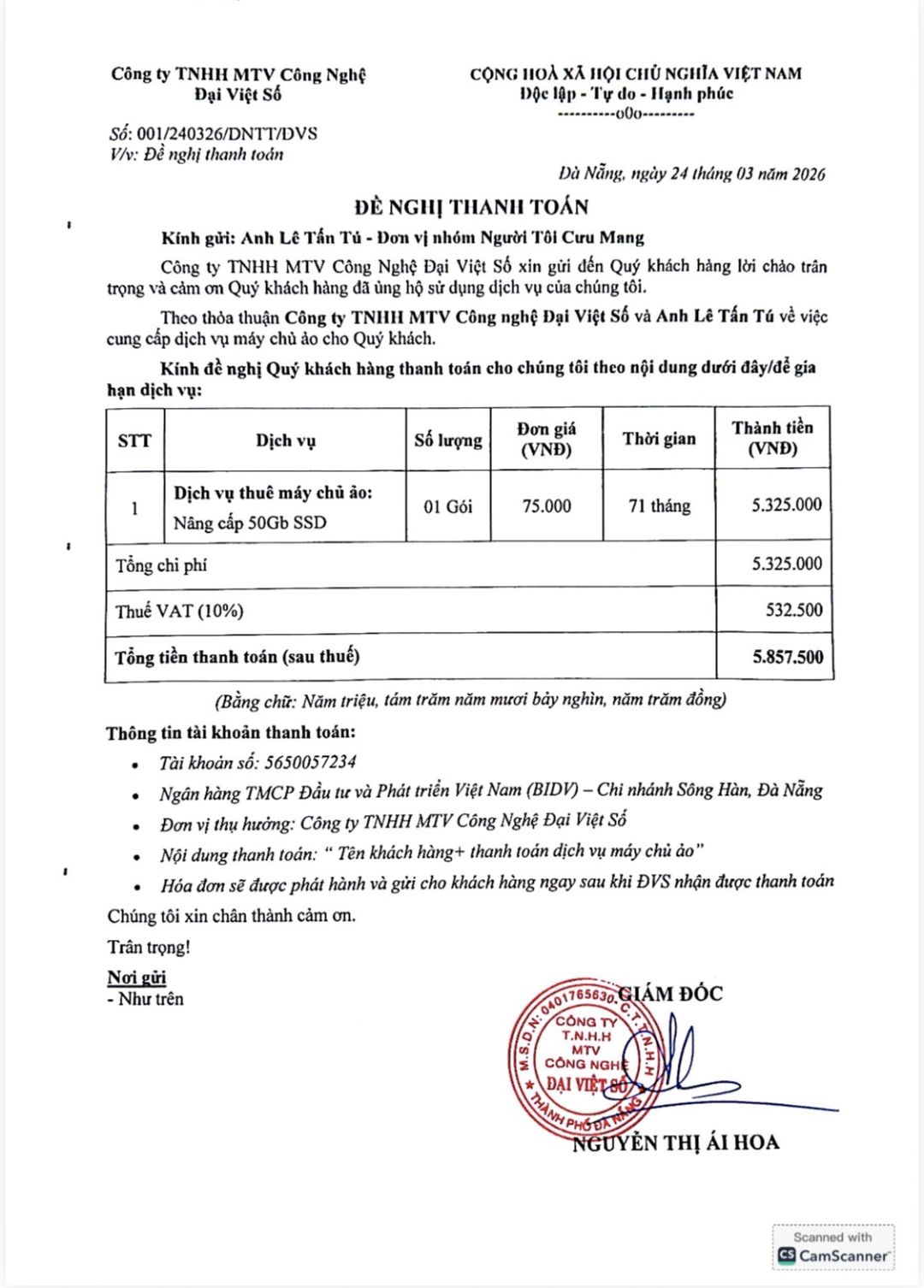 Đơn vị thụ hưởng: Cty TNHH MTV Đại Việt Số
