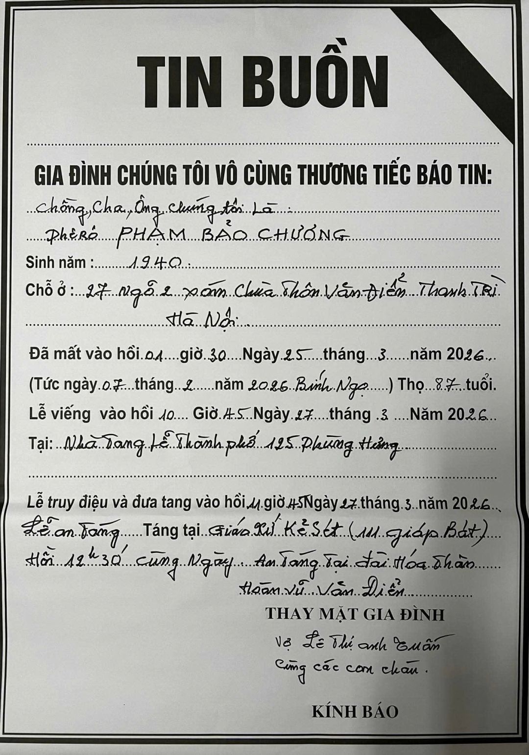 NTCM Miền Bắc xin được thông báo tin buồn - Ông Phạm Bảo Chương, thân phụ thành viên Maitan vừa qua đời, hường thọ 87 tuổi.
