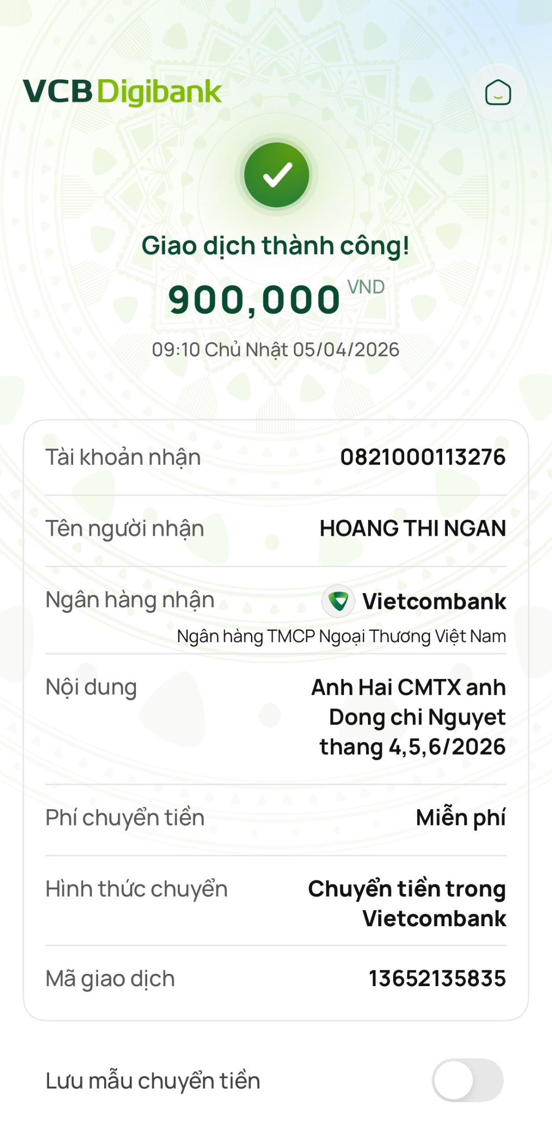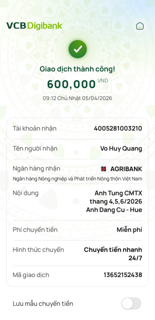 Anh Tùng chuyển 900,000đ CMTX 3 tháng 4,5,6/2026