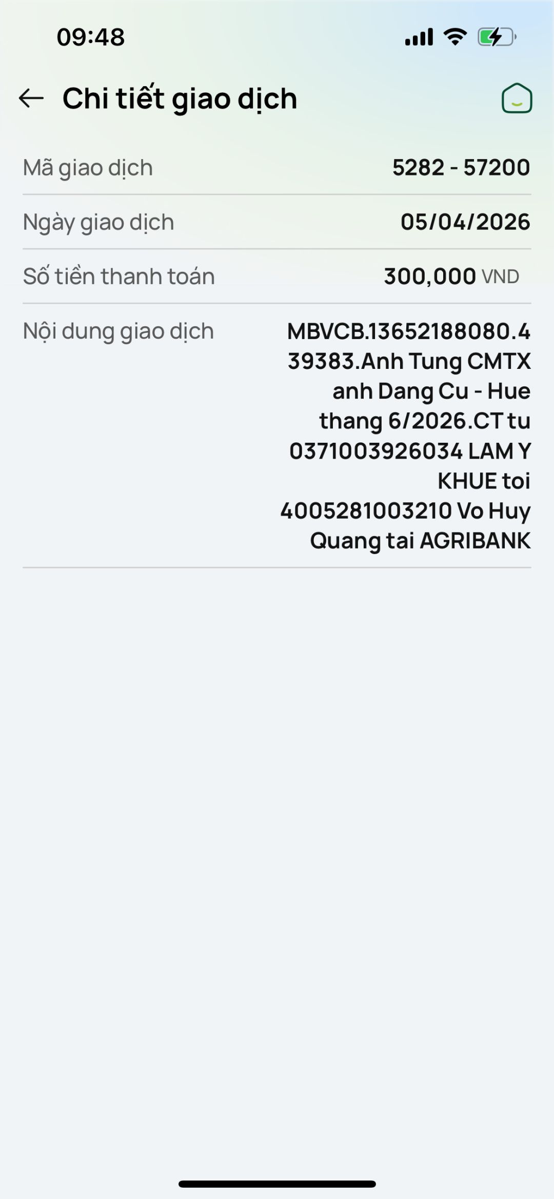 Tieuhuongduong đã chuyển 300,000đ CMTX tháng 4/2026 của Whoadung đến cháu Hiếu.