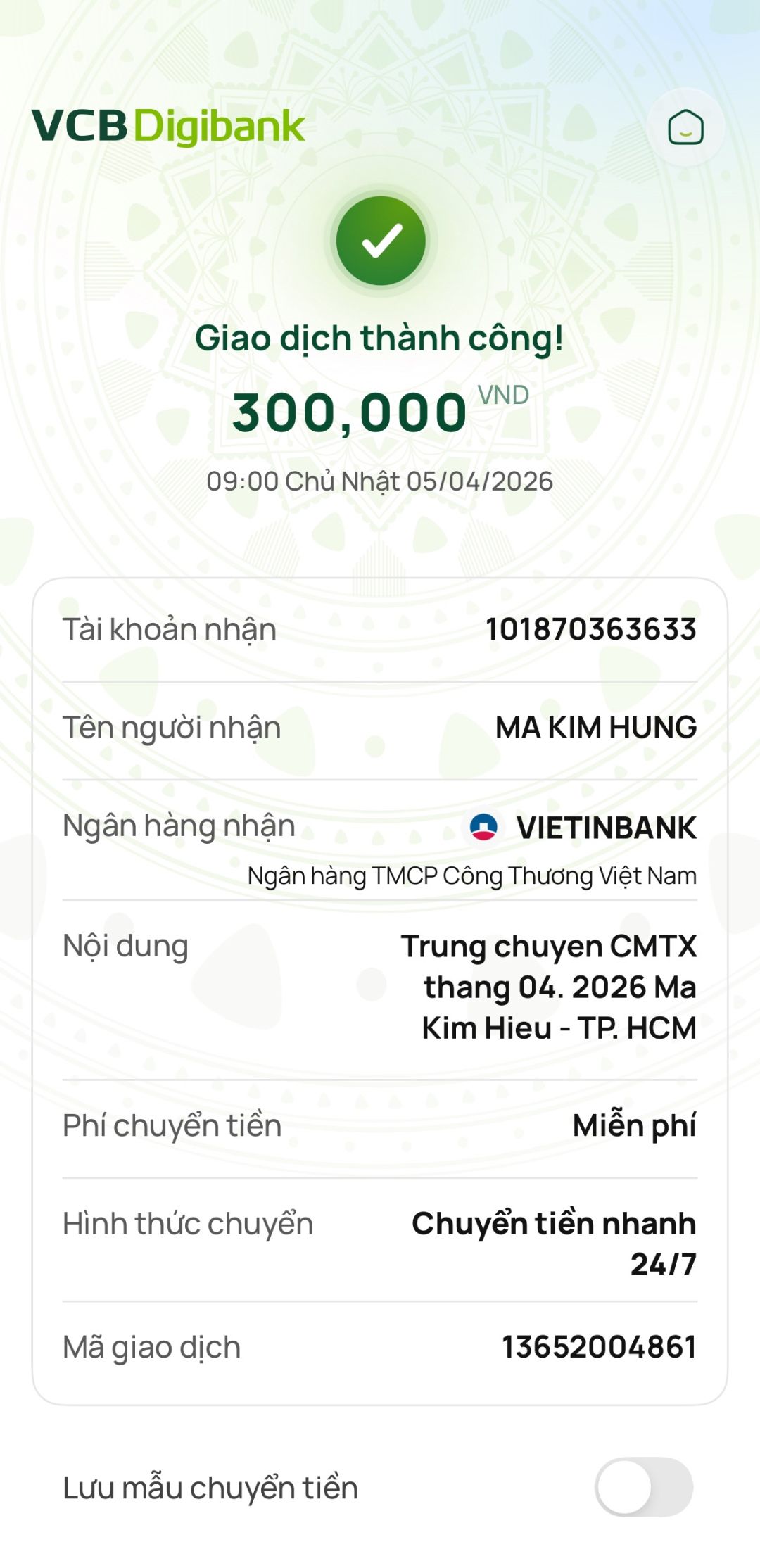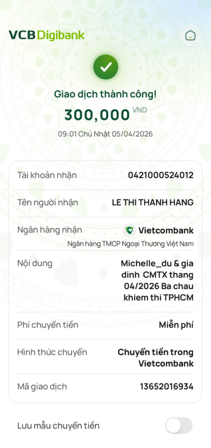 Tieuhuongduong đã trung chuyển 300,000đ CMTX tháng 4/2026 của Michelle_du và gia đình, 300,000đ của chị Thanh Huy.