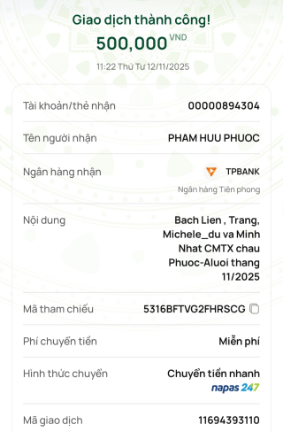 Tiền CMTX tháng 11/2025 từ Michele_du và Gia đình cùng Minh Nhật đã gửi tới người nhà cháu Ước.