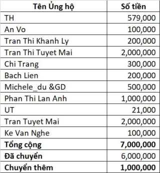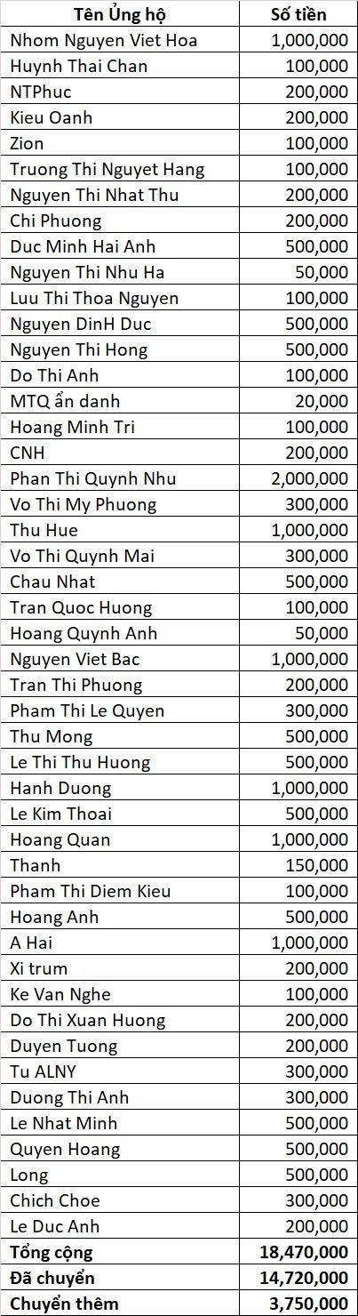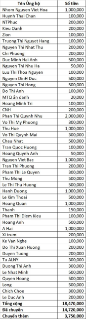 Vịt gửi thống kê ủng hộ tới thời điểm này là 14.720.000đ. Anh Banbe6x điều phối giùm em nha.