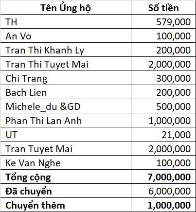 Vịt tổng hợp số tiền hỗ trợ mai táng bà Phơn tới hôm nay là 7.000.000đ, đã chuyển 6.000.000đ, Anh Banbe6x điều phối chuyển phần còn lại 1.000.000đ