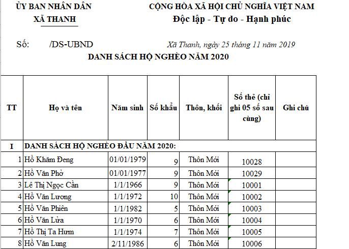 Dạ dragonfly xin cập nhật danh sách 395 hộ nghèo (năm 2020) từ anh Cất (chủ tịch xã) gửi: