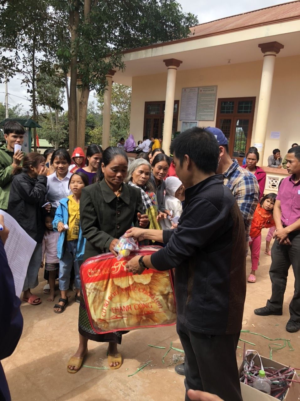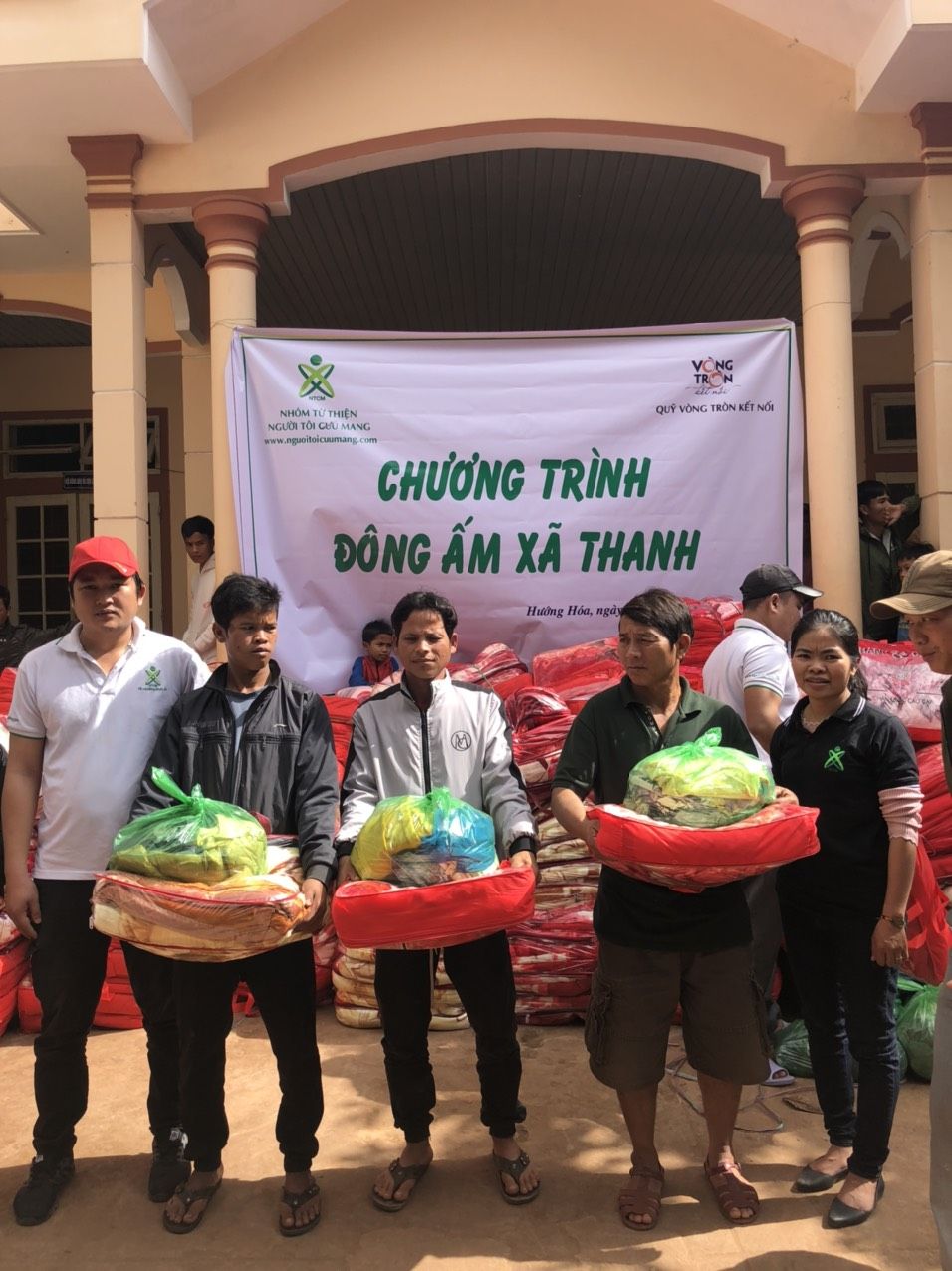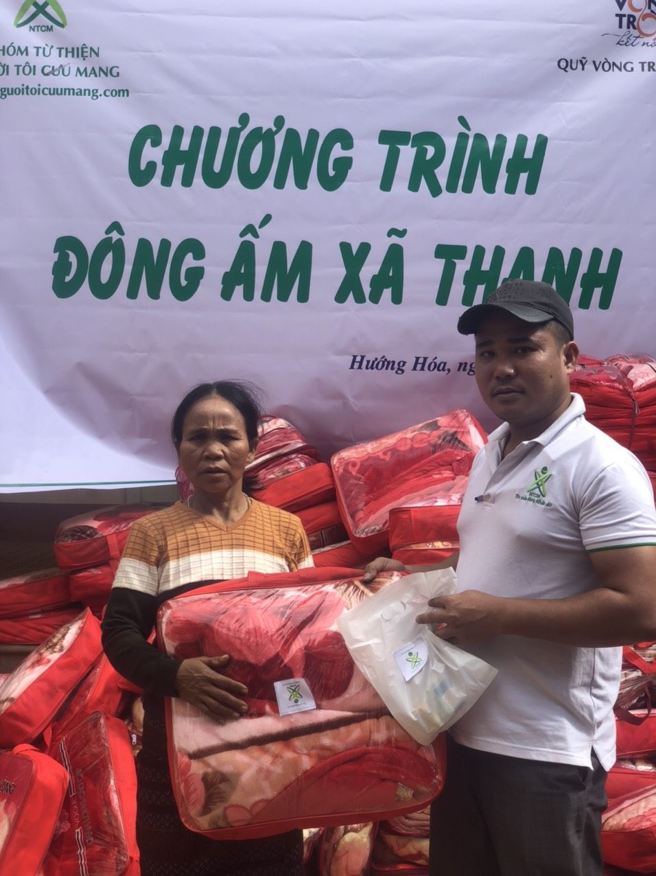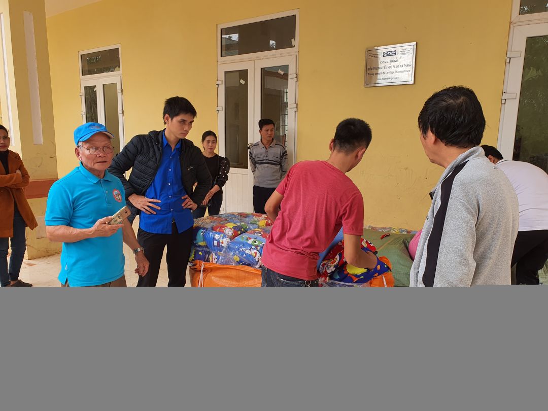 Nhóm 1: Trao quà cho 395 hộ nghèo tại Ủy ban xã (1 chăn mới/hộ+ 1 bao áo quần cũ (đã được chọn lọc và xếp gọn gàng) hoặc 1 gói thuốc (gồm 1 số thuốc cơ bản cần dùng như dầu, thuốc đau bungk, hạ sốt, ...)