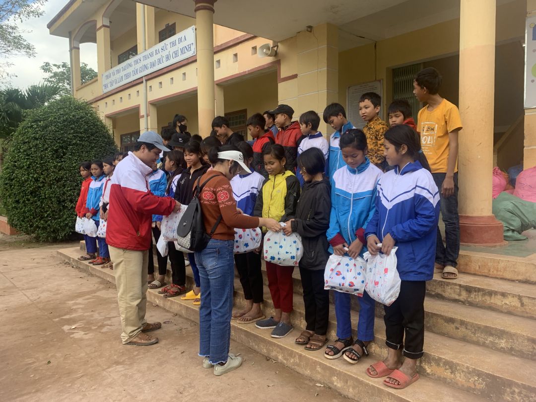 Nhóm 2: Trao quà cho 393 e học sinh trường THCS Thanh (1 cái áo mưa, 1 đôi dép, 1 bánh xà phòng lifebuoy, 1 cái mũ lưỡi trai) và áo quần cũ, vở, mũ len