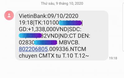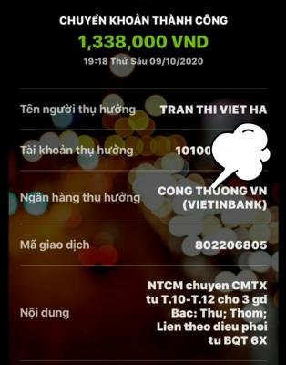 Khoản tiền CMTX Gạo và các nhu yếu phẩm của Gia đình bác Thu 206,000đ đã được chuyển tới Tran Ha ngày 9/10/2020 (duyệt chuyển tiền ngày 8/10/2020 rồi nên 6x sẽ trừ ra trong khoản đề xuất tổng hợp xuất tiền CMTX khu vực Huế tháng 10 này các bạn nhé.