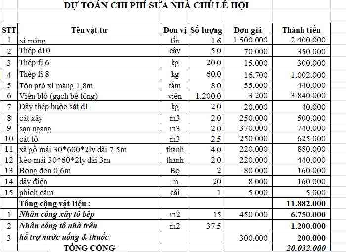 dự toán như sau: 20.032 k (chi tiết ở file ảnh đính kèm)