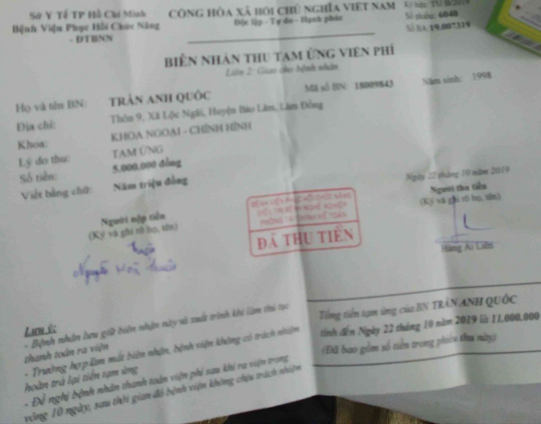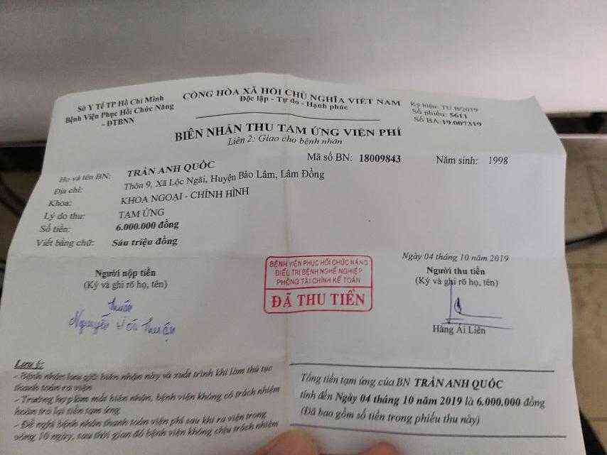 Ngày 04 tháng 10 Quốc đã mượn tiền của anh Sơn, bệnh nhân ở giường kế bên để đóng tạm ứng và kịp tiến độ để mổ một bên mông.