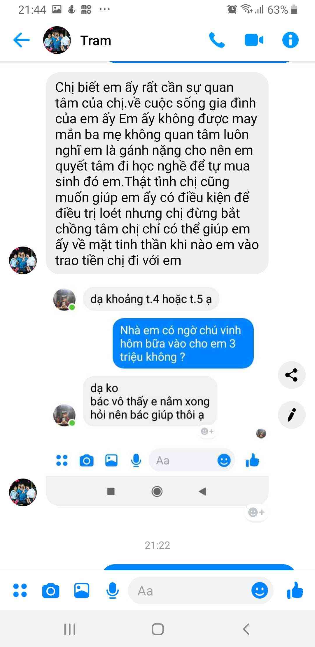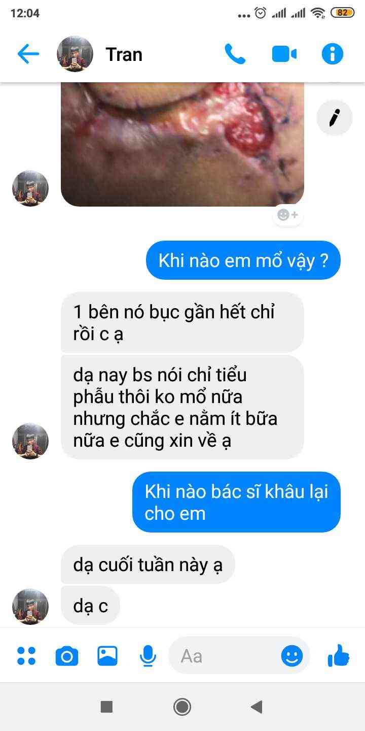 Dưới đây là cuộc trò chuyện của Mai Trâm với em Quốc và hình ảnh vết lở loét của em xin đến cả nhà cùng nắm được.
