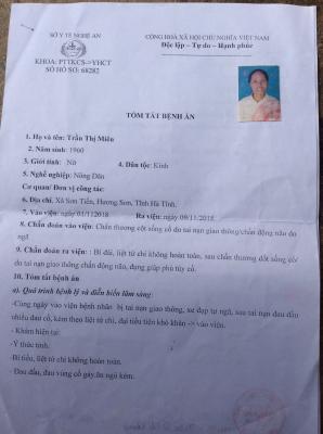 Hiện tại tình trạng chị tương đối nặng. Chị ban đầu điều trị tại bệnh viện Đa Khoa Nghệ An. Các bác sỹ ở đây đã yêu cầu phải mổ gắn xương đốt sống cổ, bị dịch tụy, thoát vị địa đệm phần cổ. Nếu không mổ có thể chị sẽ bị tê liệt cả chân tay. Chị lại không có bảo hiểm y tế nên chi phí phẫu thuật là 80 triệu là rất lớn đối với chị. Giờ chi phí như vậy thì không biết lấy đâu ra. Hiện tại Chị đã được chuyển qua tại bệnh viện y học cổ truyền để bớt chi phí gánh nặng hàng ngày cho người thân.
