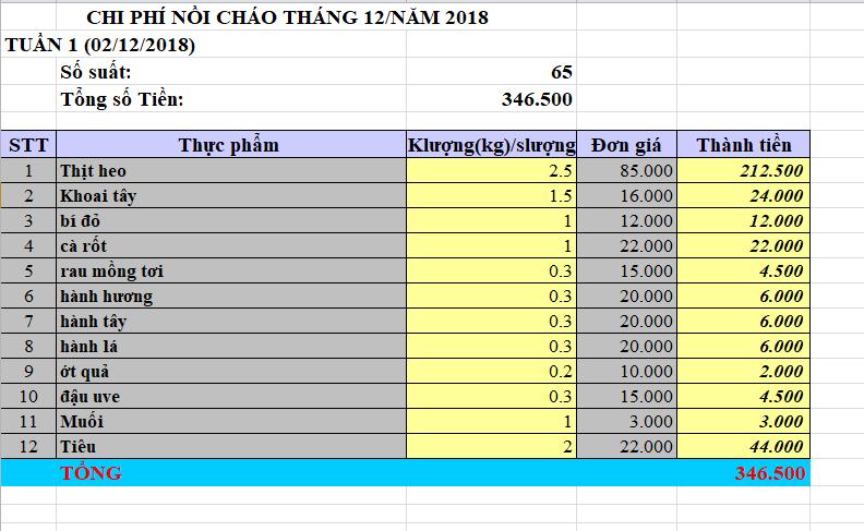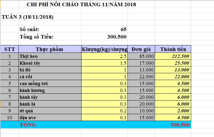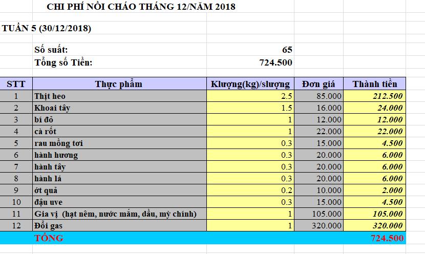 Từ Tháng 04/2018, nồi cháo Quảng Trị nấu tuần cách tuần nên chi Phí đi chợ  tháng 4/2018 như sau: