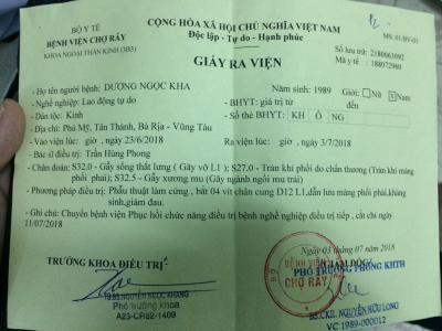 Chú Vinh và vợ hiện đang ở Xóm Quỳnh Khôi, Xã Khánh Thành, Huyện Yên Thành, Tỉnh Nghệ An. Nghe tin anh Dương Ngọc Kha, sinh năm 1989, anh bị té, ngã khi đang đi làm mái tôn ở tỉnh Vũng Tàu bị rơi từ trên mái tôn xuống đất. Sau khi bị Tai nạn anh Dương được đưa tới bệnh viện Chợ Rẫy khám và điều trị, Anh Dương bị Gẫy sống lưng ( Gãy vỡ L1); Tràn khí phổi phải do chấn thương, Gãy xương mu ( Gãy ngành ngồi mu trái ), anh Dương không có bảo hiểm y tế, công việc không ổn định nên cũng không dành dụm được nhiều tiên. Tại họa ập đến bất ngờ khiến gia đình chú Vinh phải chạy đôn, chạy đáo, ngược xuôi để vay mượn gần 70tr đồng để chữa bệnh cho anh Kha.
