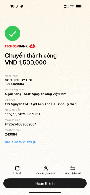 Bạn Chi Nguyen chuyển CMTX Quý 3.2025 (7-8-9/2025) tới Thuy Linh Vo, nhờ bạn thăm hỏi anh Ánh giùm nhé!