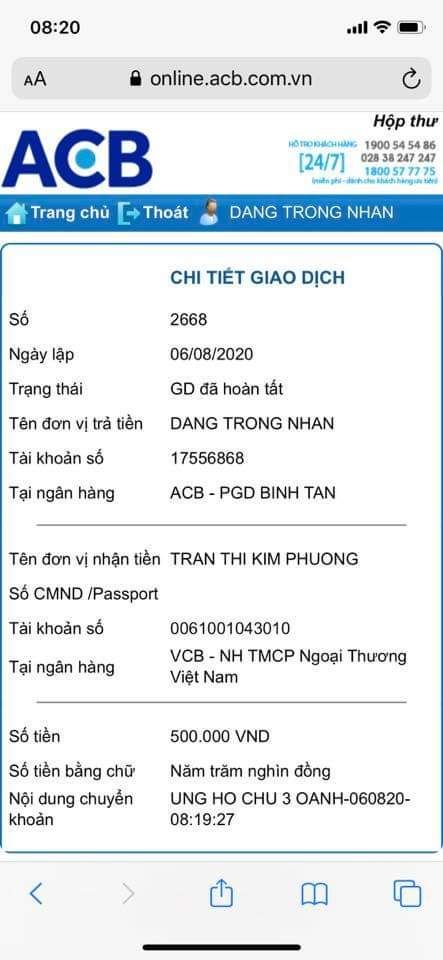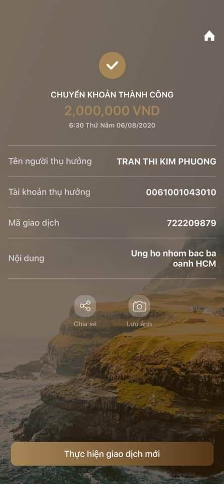 Chị Trang Tống ủng hộ cho đội của bác Ba Oanh 2,000,000đ, letuantu đã chuyển tiền cho chị Thocon.