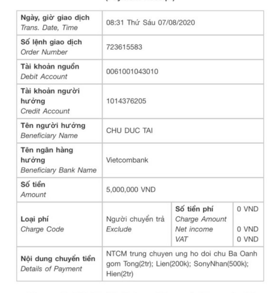 Như vậy số tiền 5,000,000đ như đề xuất đã đủ, nhờ TĐP duyệt chuyển tiền, nhờ @DucTai trao cho đội mai táng của bác Ba Oanh giúp nhé.