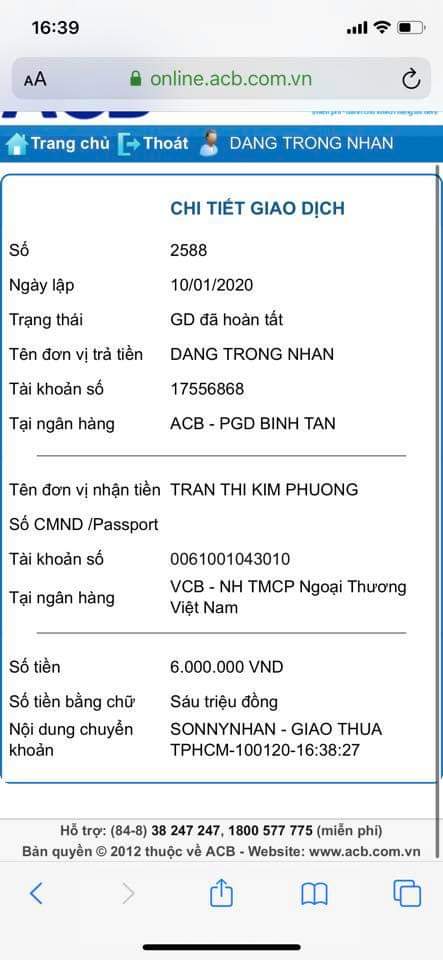 6/ Cô Hồ Thị Nguyệt Nga : 200,000đ
