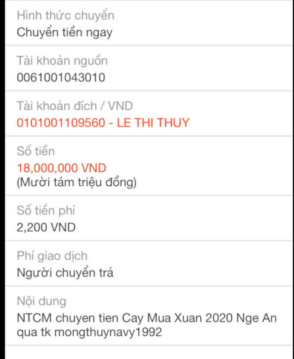 @Thocon : Em chuyển tới Mongthuynavy1992 số tiền 18,000,000đ để các bạn Nghệ An đặt hàng thực hiện chương trình dùm nhé.