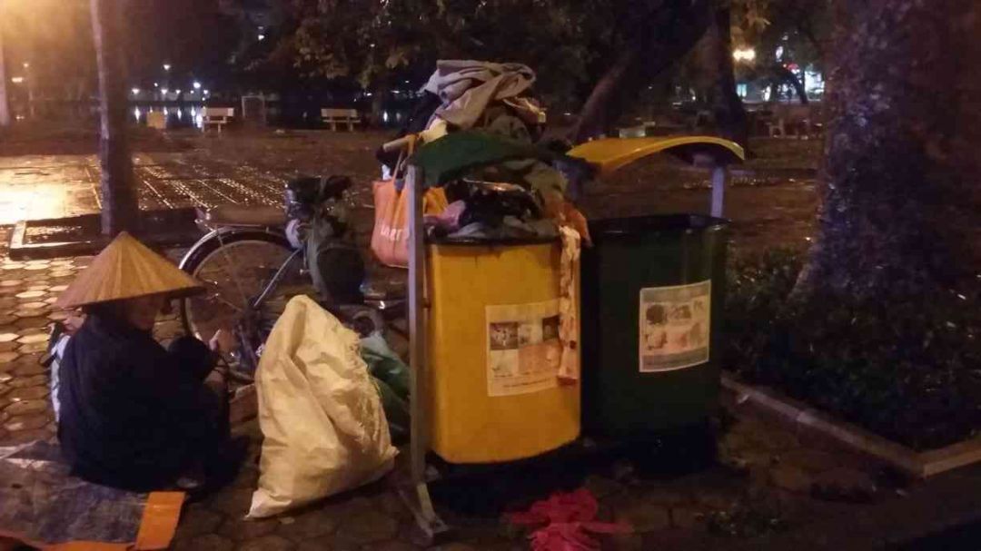 23h15 mưa ngớt, hành trình của chúng tôi lại tiếp tục. Dưới mái hiên cách bệnh viện không xa là một đứa trẻ chừng 6 tuổi ngồi bệt co ro, bên cạnh là bé nhỏ hơn đang say ngủ trên tay mẹ. Tôi hỏi cháu có đang mệt không, mấy mẹ con đi chữa bệnh hay sao? Chị bảo không, cháu ngủ thôi, em làm nghề nhặt rác, bình thường 3 mẹ con thuê trọ cùng nhiều người ngoài bờ sông nhưng Tết mọi người về quê hết, em thì chả đi làm được mà thuê phòng không có người chung cũng đắt, để tiết kiệm chị dắt 2 con ra đường tá túc vài hôm đợi nhóm thuê trọ trở lại thuê cùng, tiện cũng đi nhặt rác luôn.