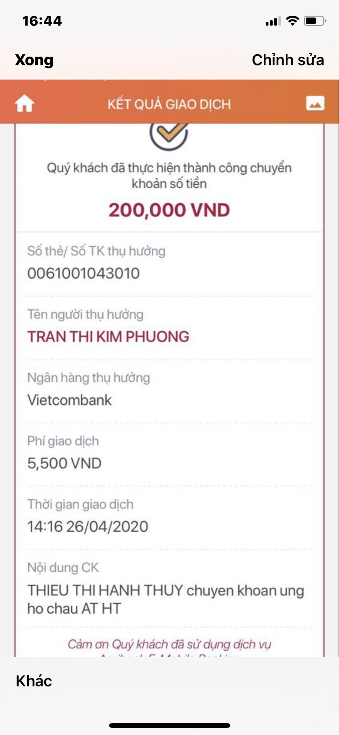 26/4 fb Thiều Thuý Hạnh đã chuyễn ủng hộ 200.000