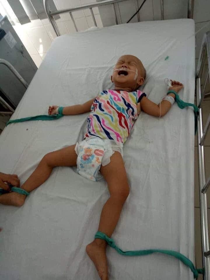 Cháu bị bệnh Ung thư máu nằm viện hơn 9 tháng nay rồi. Hàng ngày phải tiêm, chọc tủy, xét nghiệm, lại thêm bệnh thiếu tiểu cầu, viêm tủy, phù gan thận, mỗi lúc lên cơn co giật BS phải buộc chân, buộc tay cháu lại.