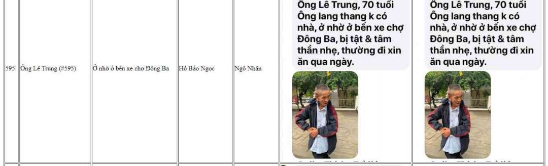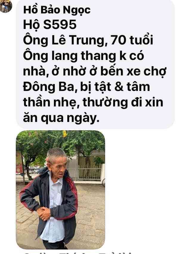 Còn trường hợp Ông Lê Trung (#595) hay lang thang ở bến xe Đông Ba, lúc nào các bạn gặp và trao được thì bổ sung hình ảnh nhé.