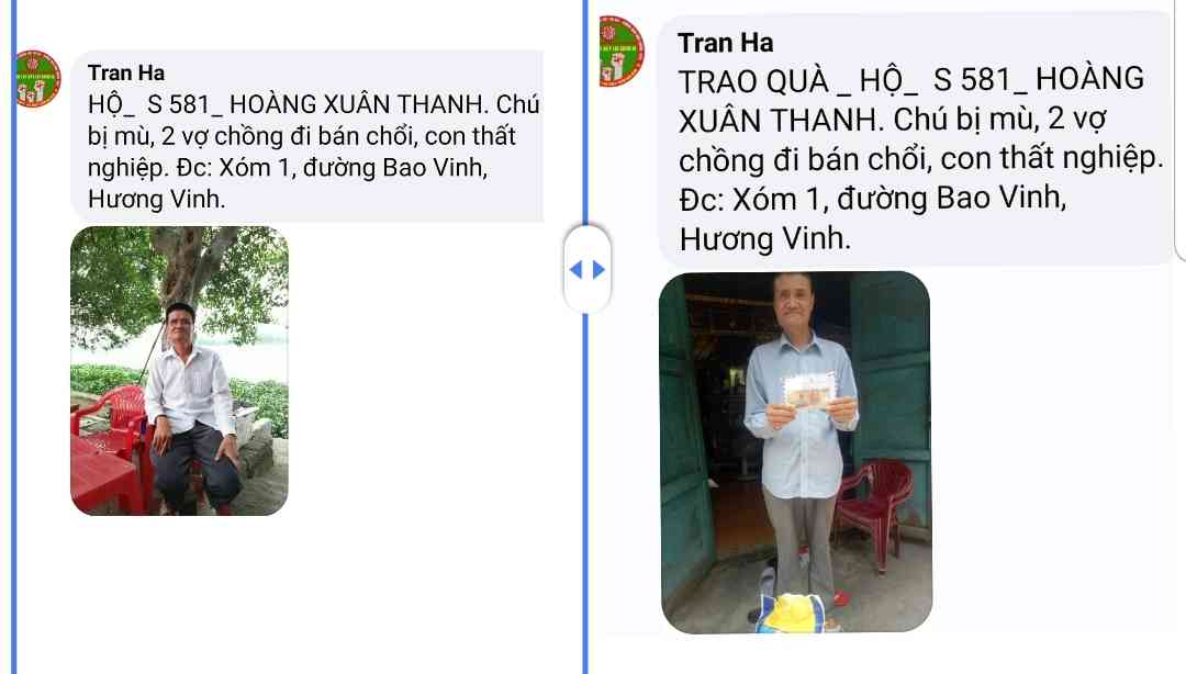 Riêng hoàn cảnh SỐ 595 chưa trao được do ông không có nhà và ở loanh quanh chợ Đông Ba. Mấy hôm nay thời tiết Huế mưa lạnh, không tìm ra Ông. TNV xin giữ lại quà để trao tận tay Ông và sẽ cập nhật ảnh ngay khi đã trao quà ạ.