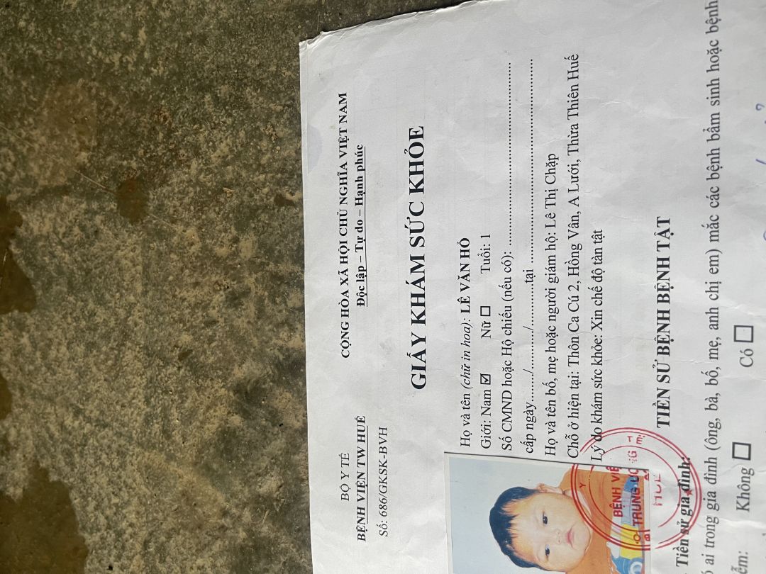 Lê Văn Hổ ,một hoàn cảnh thương tâm. Cháu hiện 16 tháng tuổi bị Viêm phổi/Bại não, gia đình thuộc hộ nghèo . Mẹ cháu là Lê Thị Chắp,hiện ở xã Hồng Vân, huyện A Lưới, tỉnh Thừa Thiên Huế. Gia cảnh nghèo khó nên gia đình cháu