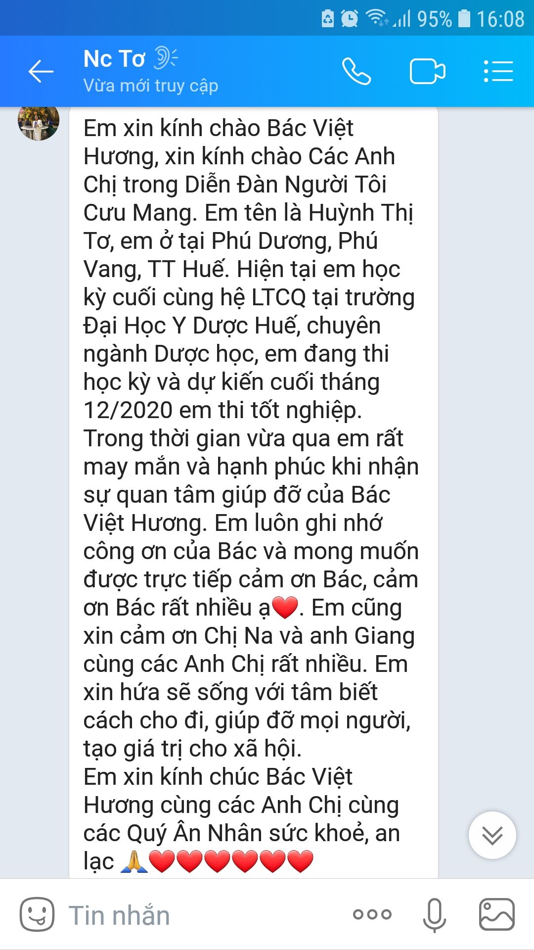 "Em xin kính chào Bác Việt Hương, xin kính chào Các Anh Chị trong Diễn Đàn Người Tôi Cưu Mang. Em tên là Huỳnh Thị Tơ, em ở tại Phú Dương, Phú Vang, TT Huế. Hiện tại em học kỳ cuối cùng hệ LTCQ tại trường Đại Học Y Dược Huế, chuyên ngành Dược học, em đang thi học kỳ và dự kiến cuối tháng 12/2020 em thi tốt nghiệp. Trong thời gian vừa qua em rất may mắn và hạnh phúc khi nhận sự quan tâm giúp đỡ của Bác Việt Hương. Em luôn ghi nhớ công ơn của Bác và mong muốn được trực tiếp cảm ơn Bác, cảm ơn Bác rất nhiều ạ❤️. Em cũng xin cảm ơn Chị Na và anh Giang cùng các Anh Chị rất nhiều. Em xin hứa sẽ sống với tâm biết cách cho đi, giúp đỡ mọi người, tạo giá trị cho xã hội.