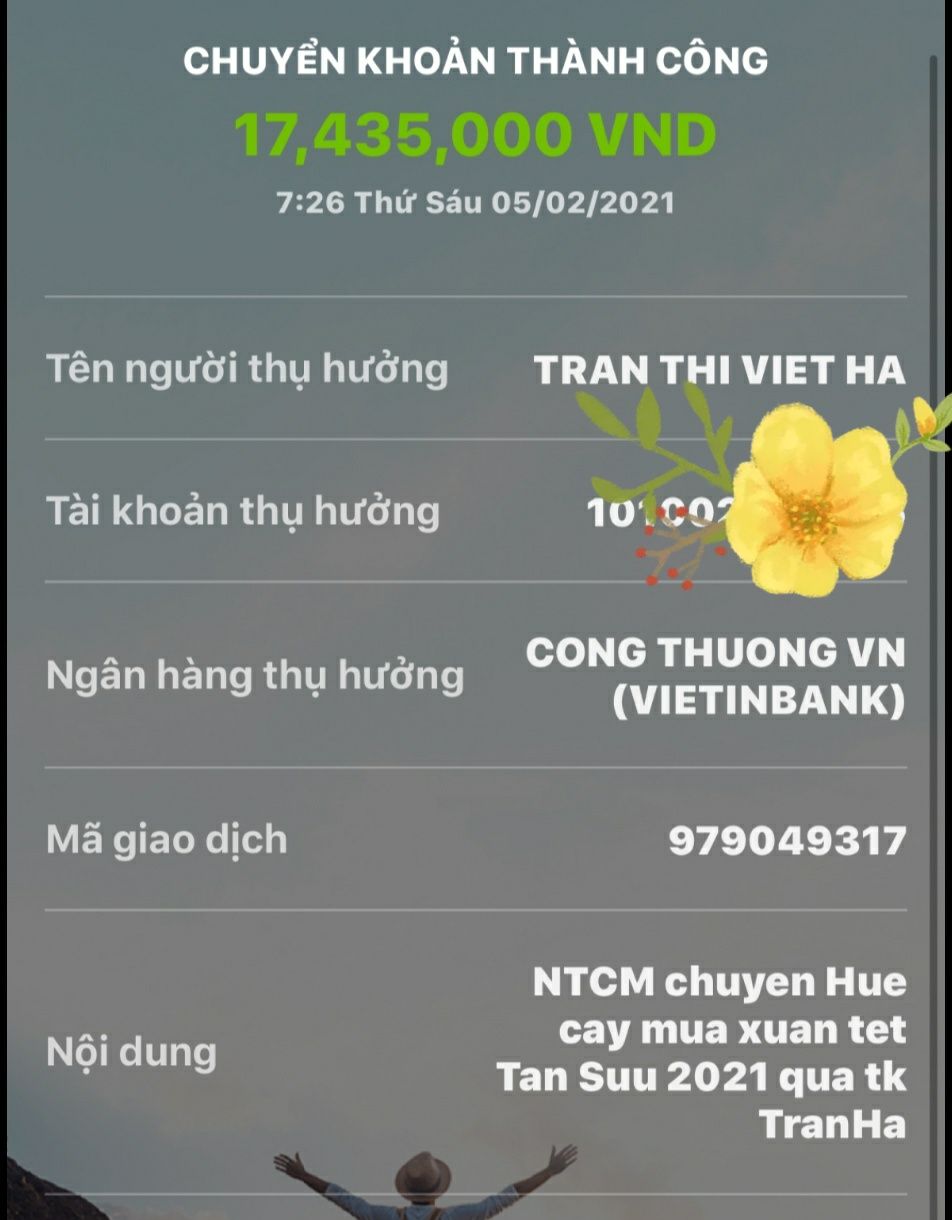 @Thocon : Em chuyển tới Tran Ha 17,435,000đ để các bạn khu vực Huế thực hiện chương trình Cây Mùa Xuân Tết Tân Sửu 2021 dùm nhé.