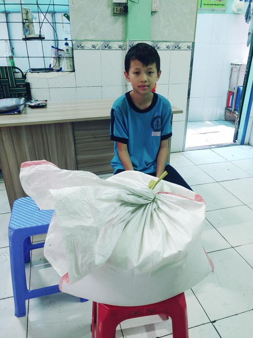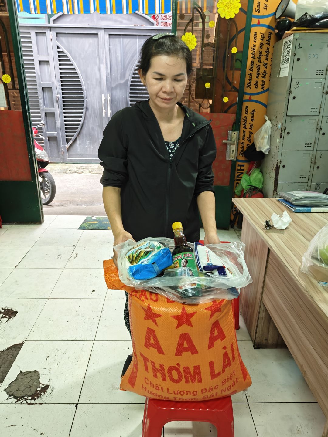 Tháng vừa rồi, bé Tú phải nhập viện để làm phẫu thuật lại nên gia đình chưa ghé lấy nhu yếu phẩm được. Tuần rồi, mẹ của bé đã ghé quán cơm để nhận gạo & nhu yếu phẩm của tháng 4 và 5.