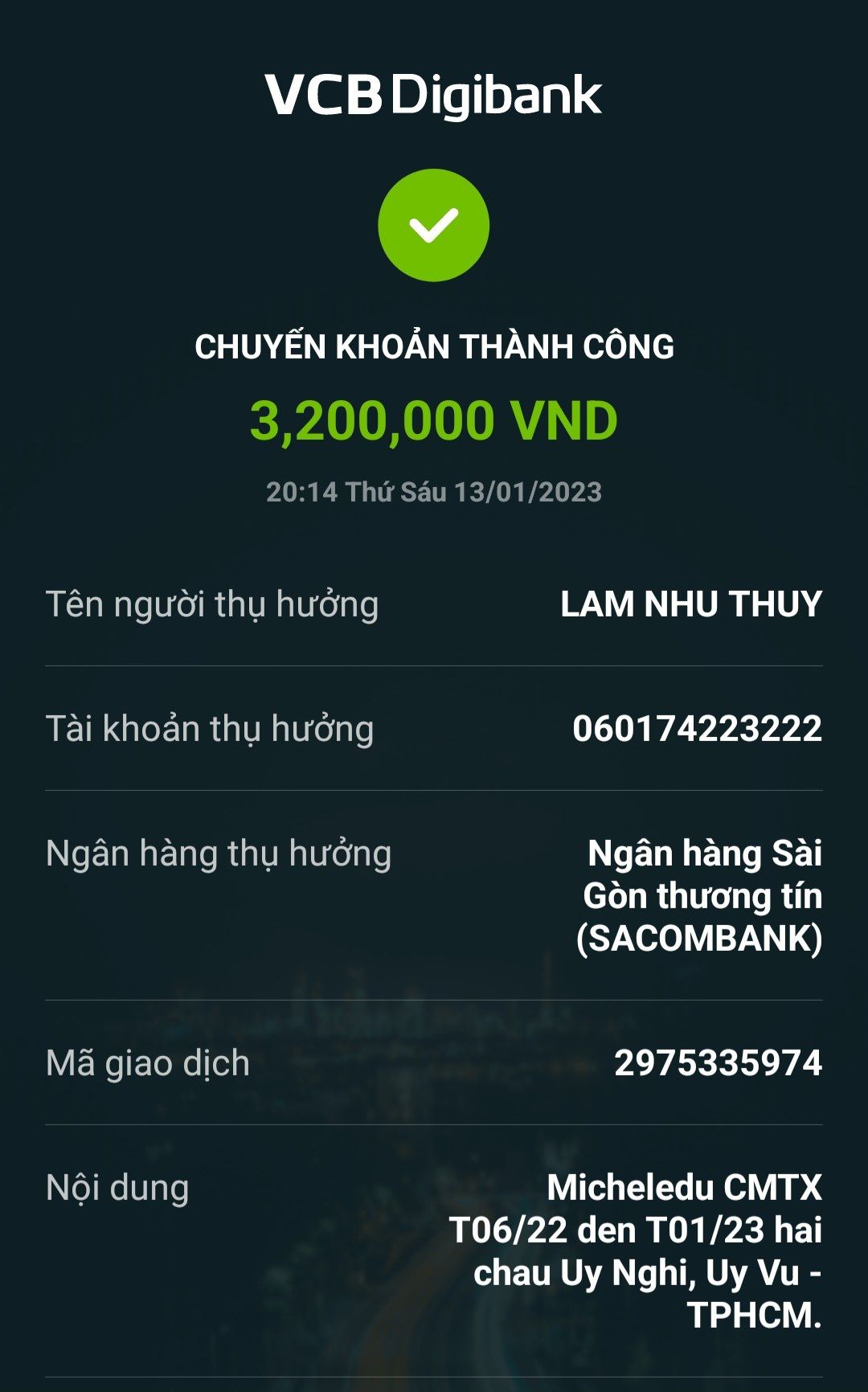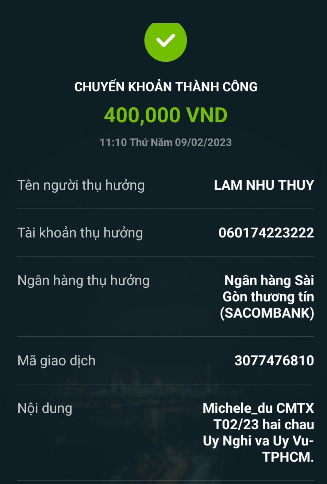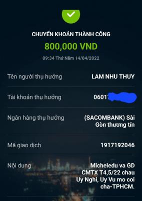 Lathuvang đã trung chuyển TK chị Thủy( Mẹ 2 cháu Uy Nghi, Uy Vũ) 800,000đ CMTX T4,5/22 của Michele_du và GĐ CMTX.