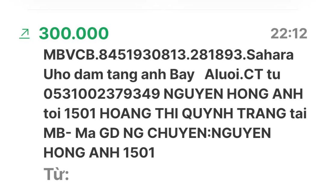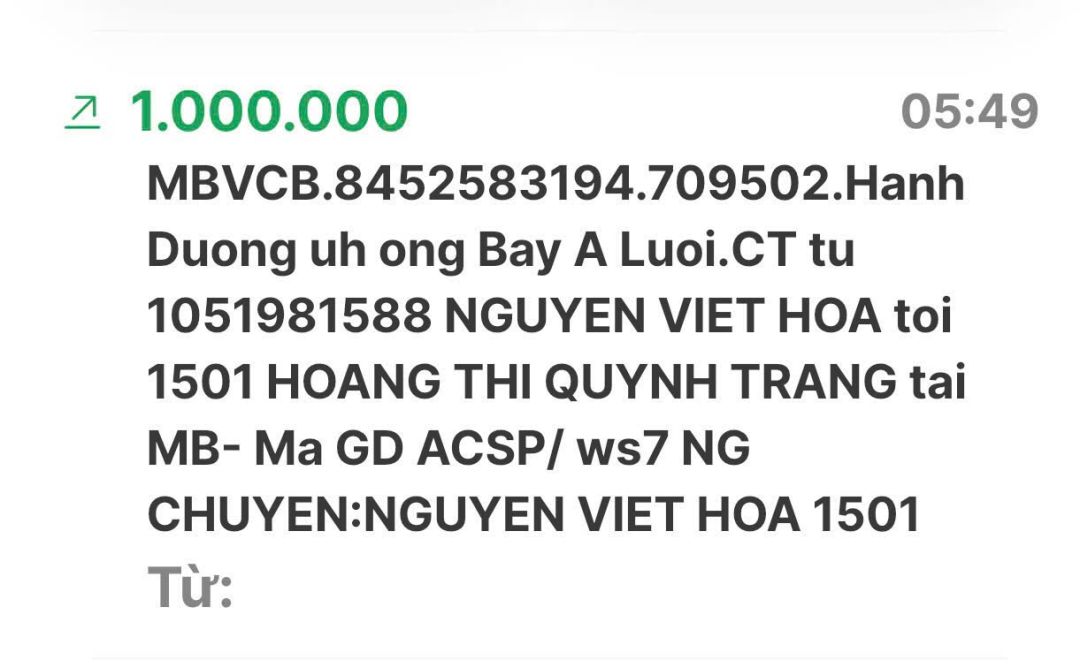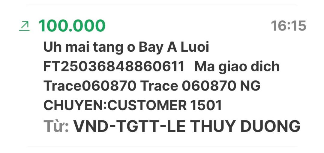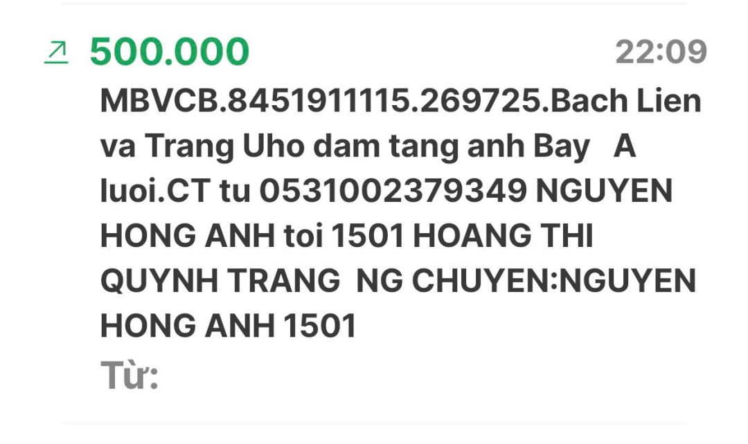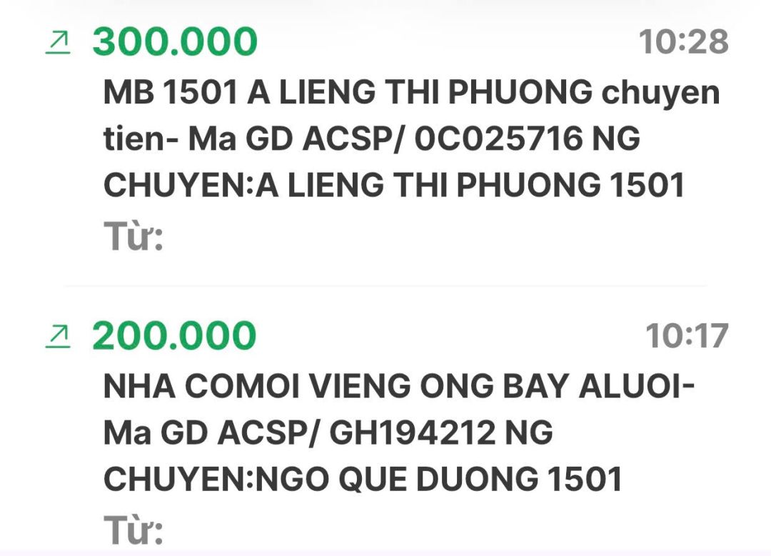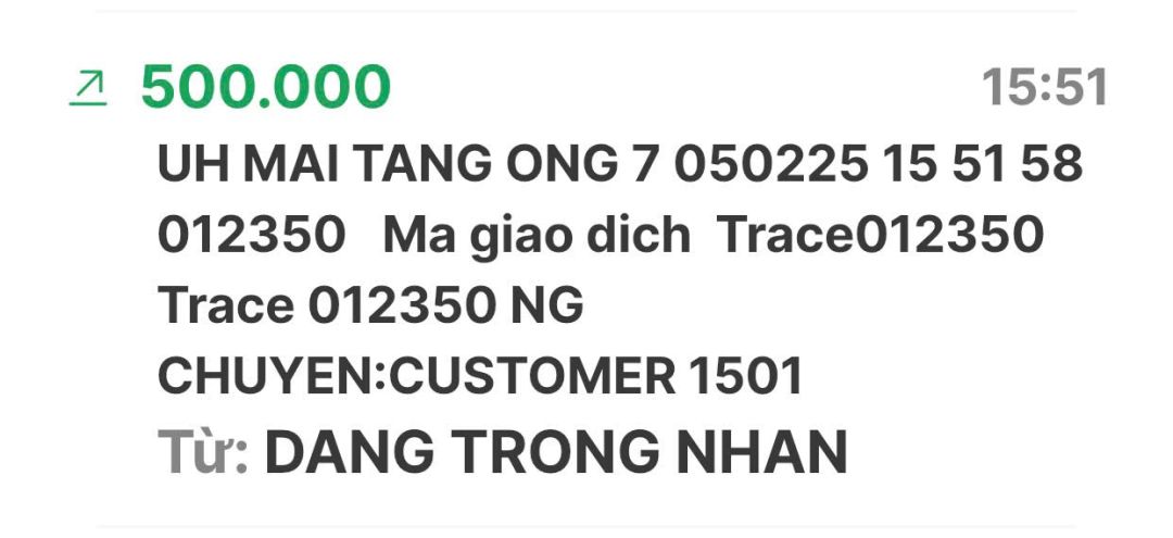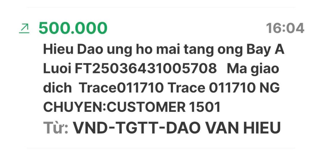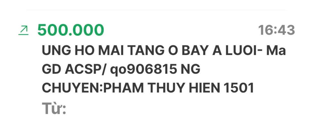 Cập nhật số tiền đến giờ 18h12 phút chiều ngày 06/02/2025 số tiền được chuyển vào TK 1501 MB Bank. Hoàng Thị Quỳnh Trang ủng hộ mai táng ông Hồ Văn Bảy ở A Lưới - Huế.