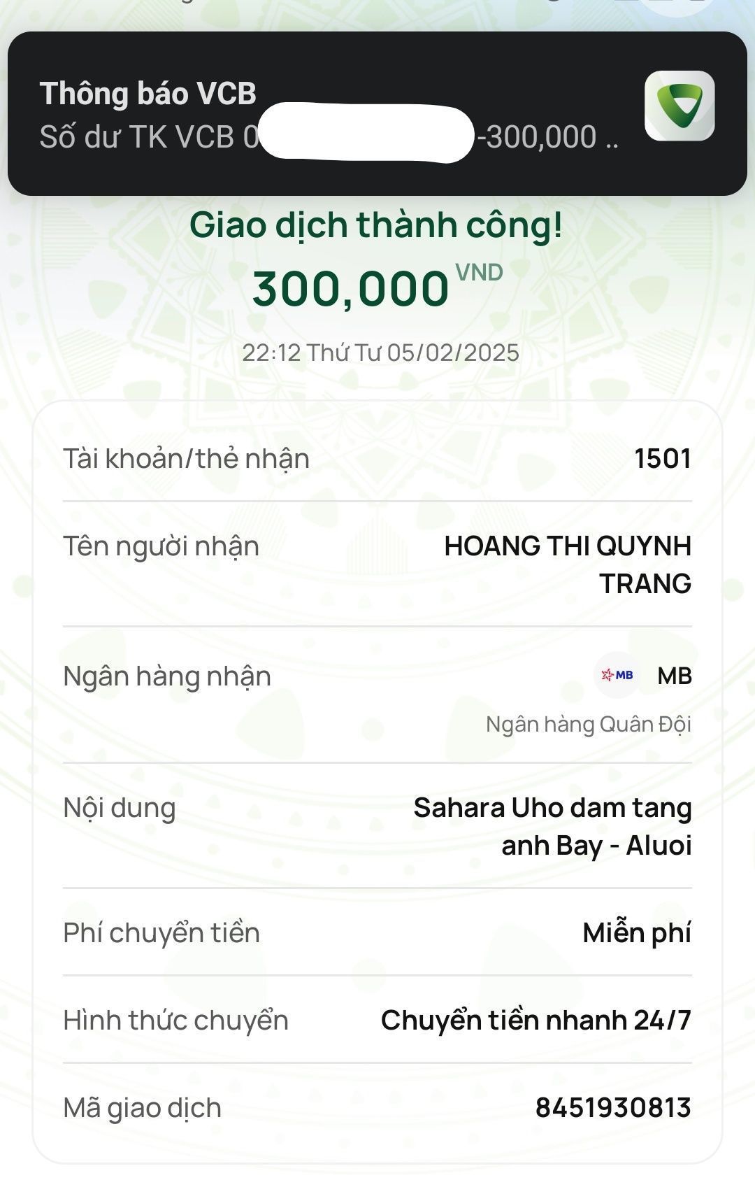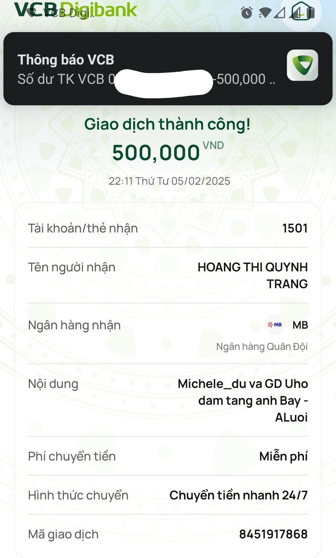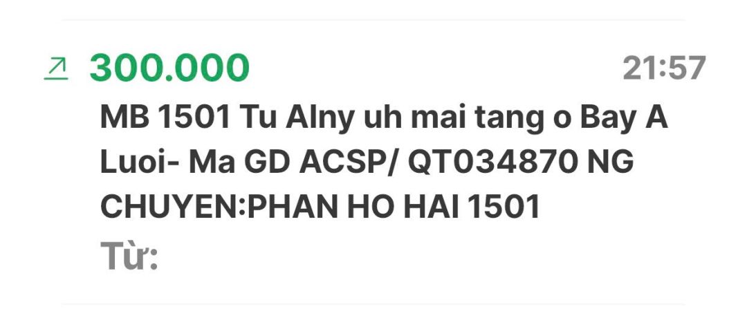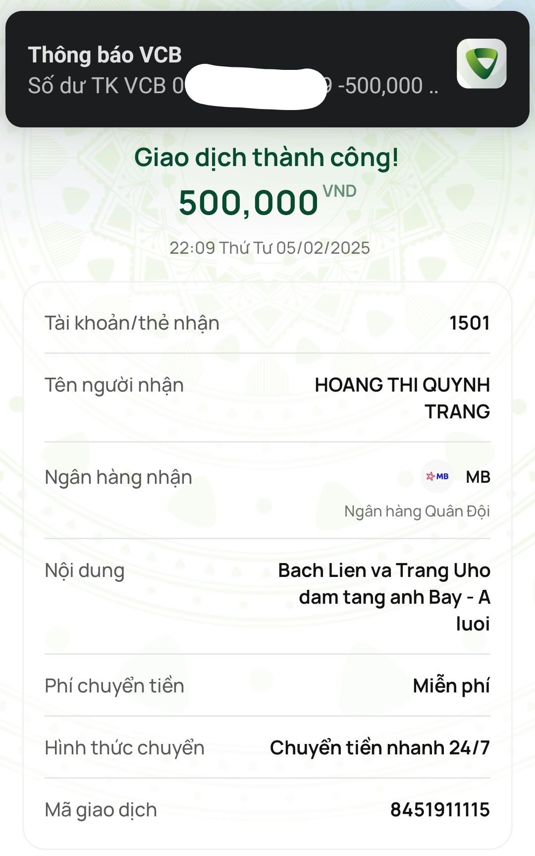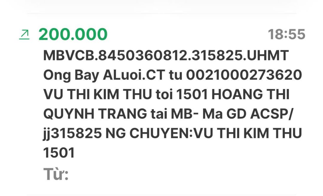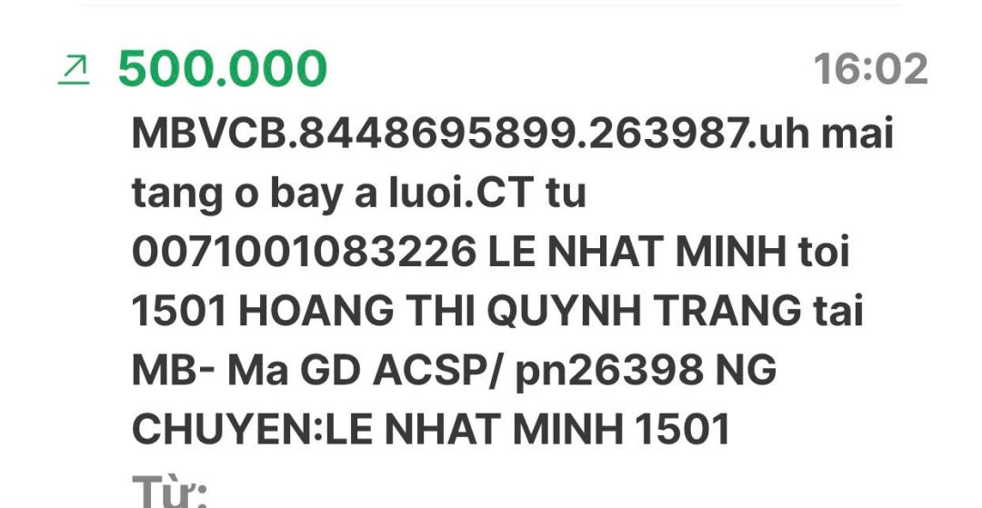 Cập nhật số tiền đến giờ 18h12 phút chiều ngày 06/02/2025 số tiền được chuyển vào TK 1501 MB Bank. Hoàng Thị Quỳnh Trang ủng hộ mai táng ông Hồ Văn Bảy ở A Lưới - Huế.