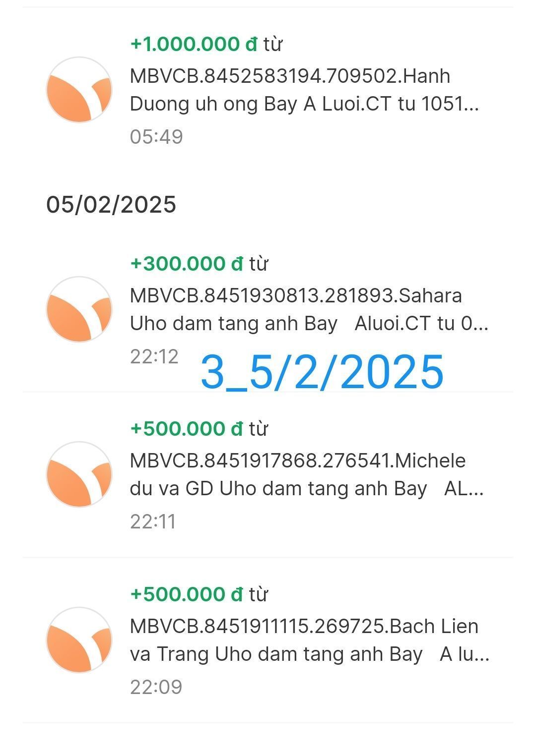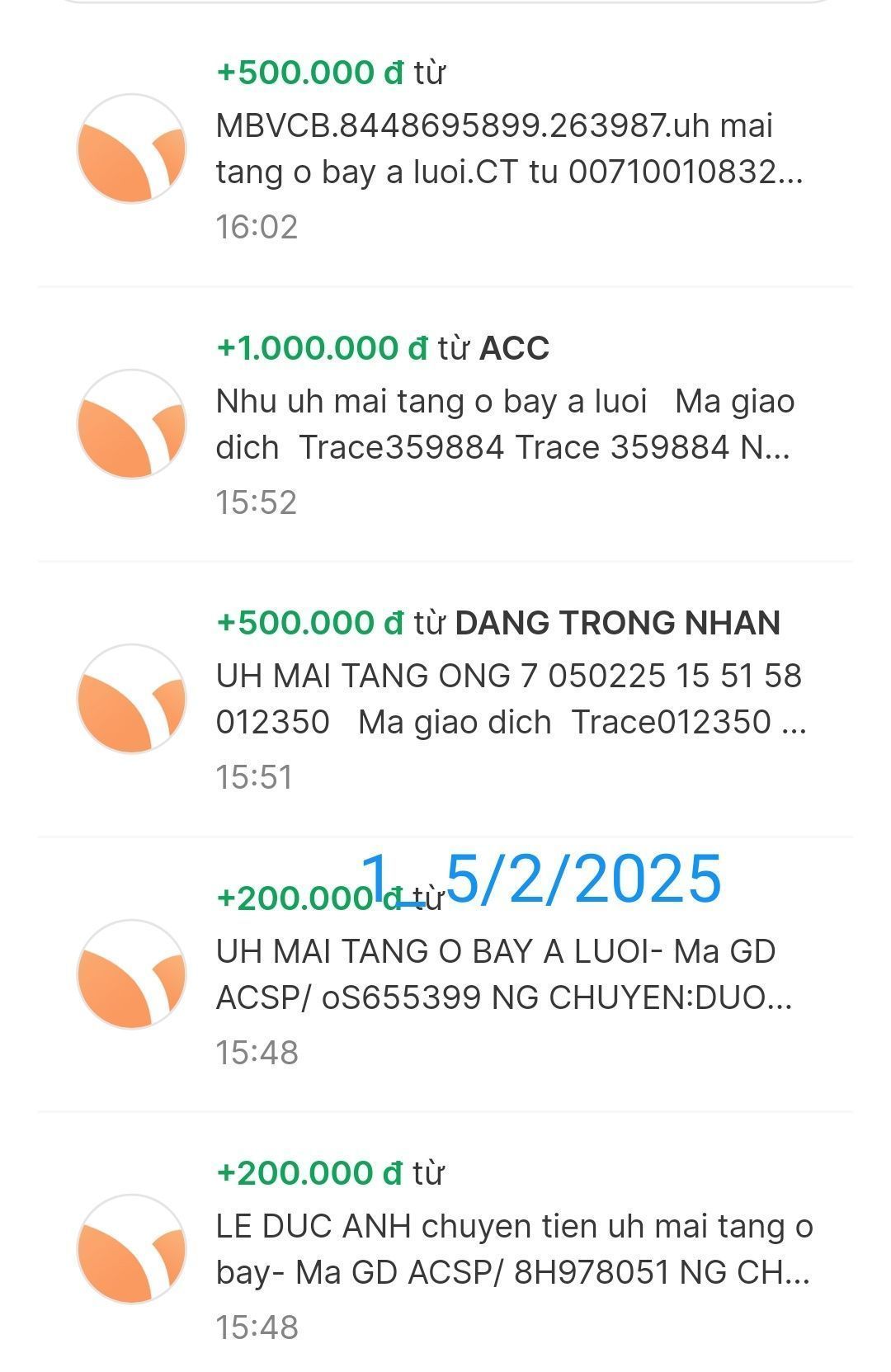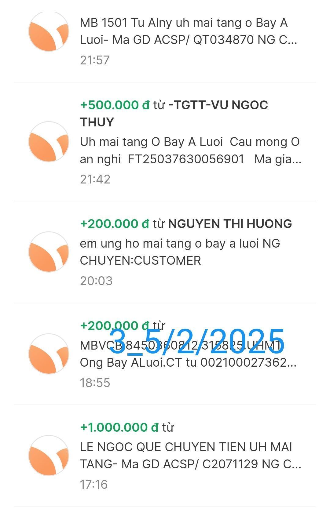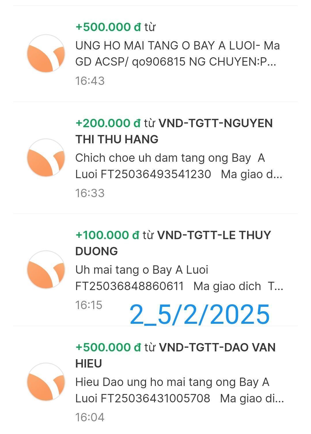 Cập nhật số tiền đến giờ 18h12 phút chiều ngày 06/02/2025 số tiền được chuyển vào TK 1501 MB Bank. Hoàng Thị Quỳnh Trang ủng hộ mai táng ông Hồ Văn Bảy ở A Lưới - Huế.