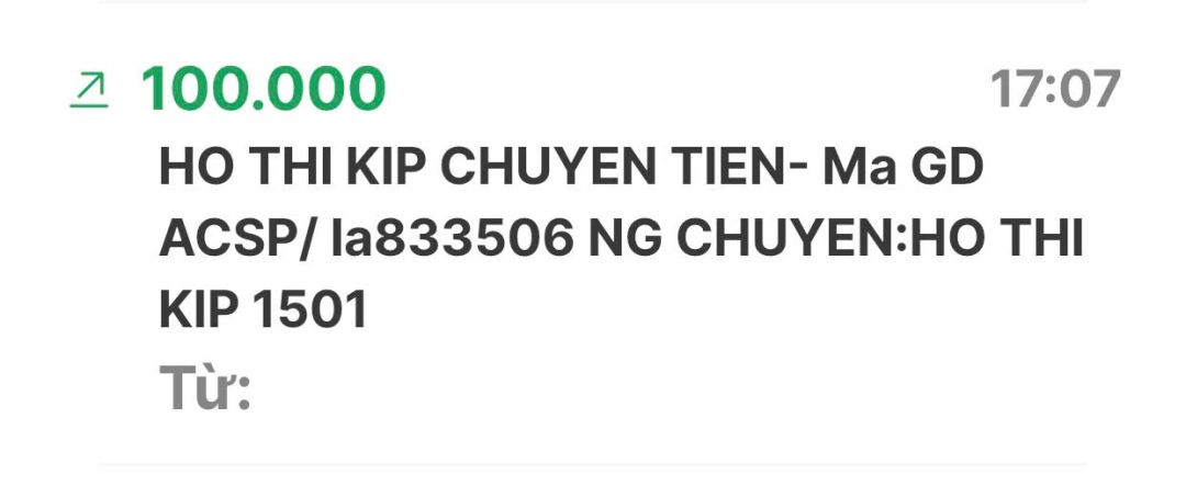 Có một tài khoản quên cú pháp tên là: Ho Thi Kip 100k