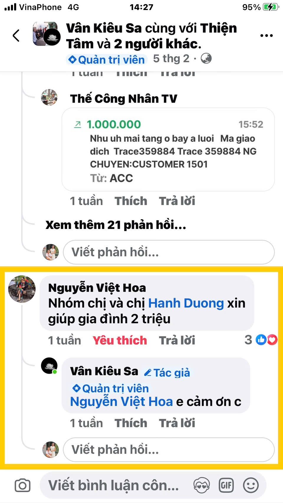 25💗. Bạn của chị Yến là bác Hồ Thị Hường ủng hộ đám tang của anh Bảy 1.000.000đ còn thiếu và nhờ quỹ NTCM chúng ta ứng tiền trước dùm (Ban quản trị đăng ký 1 triệu đồng và ban quản tri chứng thực)