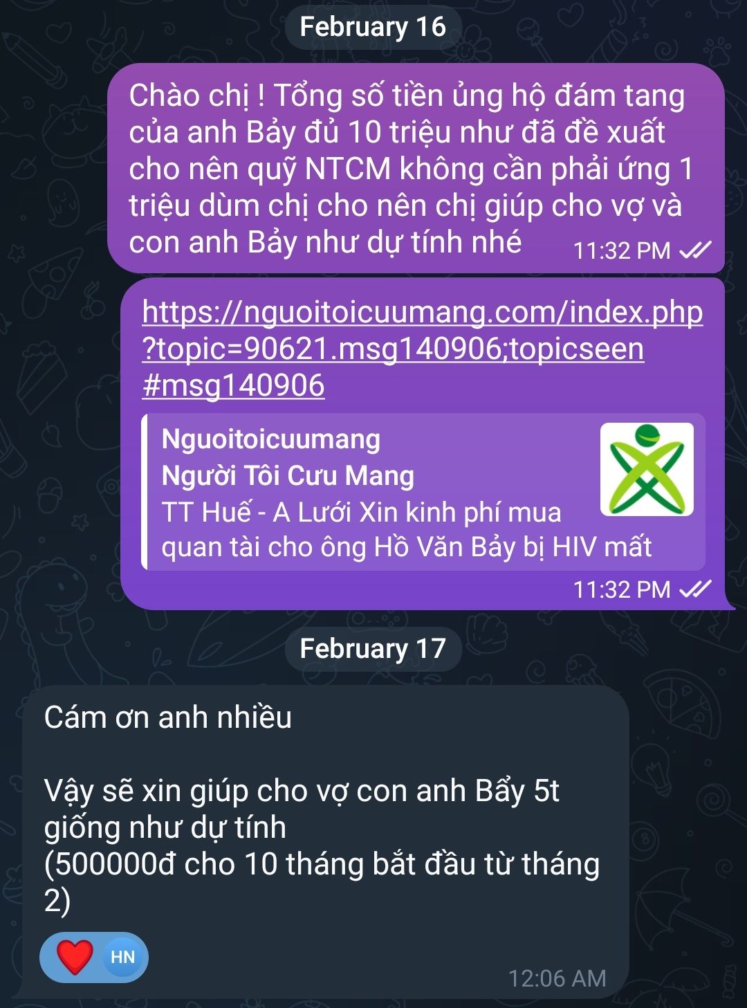 @All : Khi tiền ủng hộ đám tang của anh Bảy đủ 10 triệu đồng thì quỹ NTCM chúng ta không cần ứng trước 1,000,000₫ dùm chị Yến vì khoản tiền đó chị ấy cũng dành để giúp cho vợ và con anh Bảy theo hình thức CMTX như đã trao đổi cùng 6x trước đó.