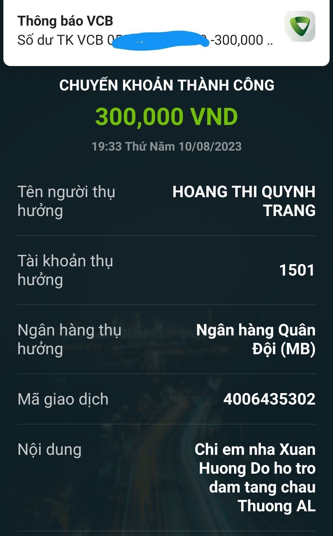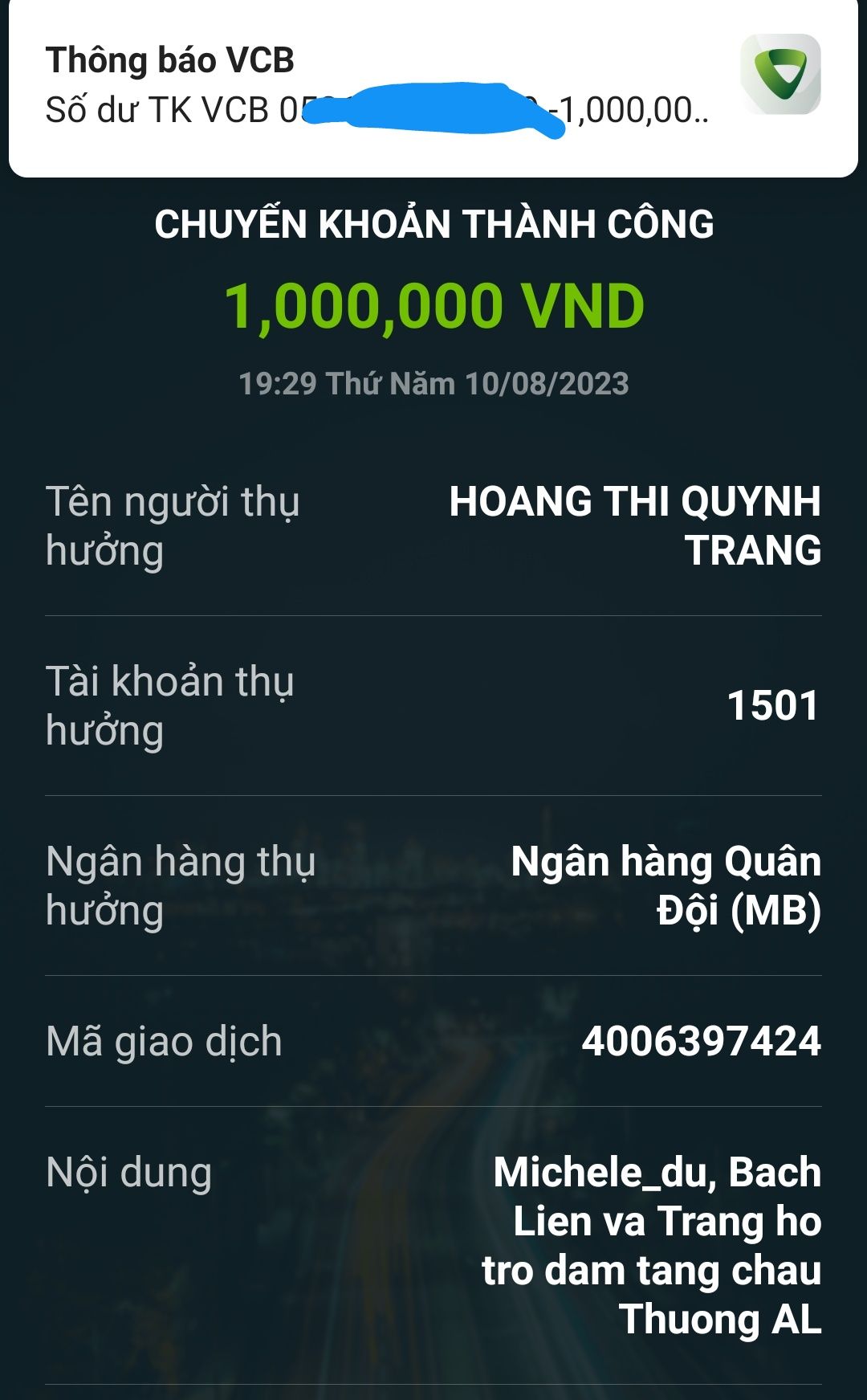 @trangvitgioi : Em chuyển nốt 6,000,000₫ còn lại cho Hồ Thị Linh Kha để bạn ấy trao tới Gia đình cháu Thượng dùm nhé.