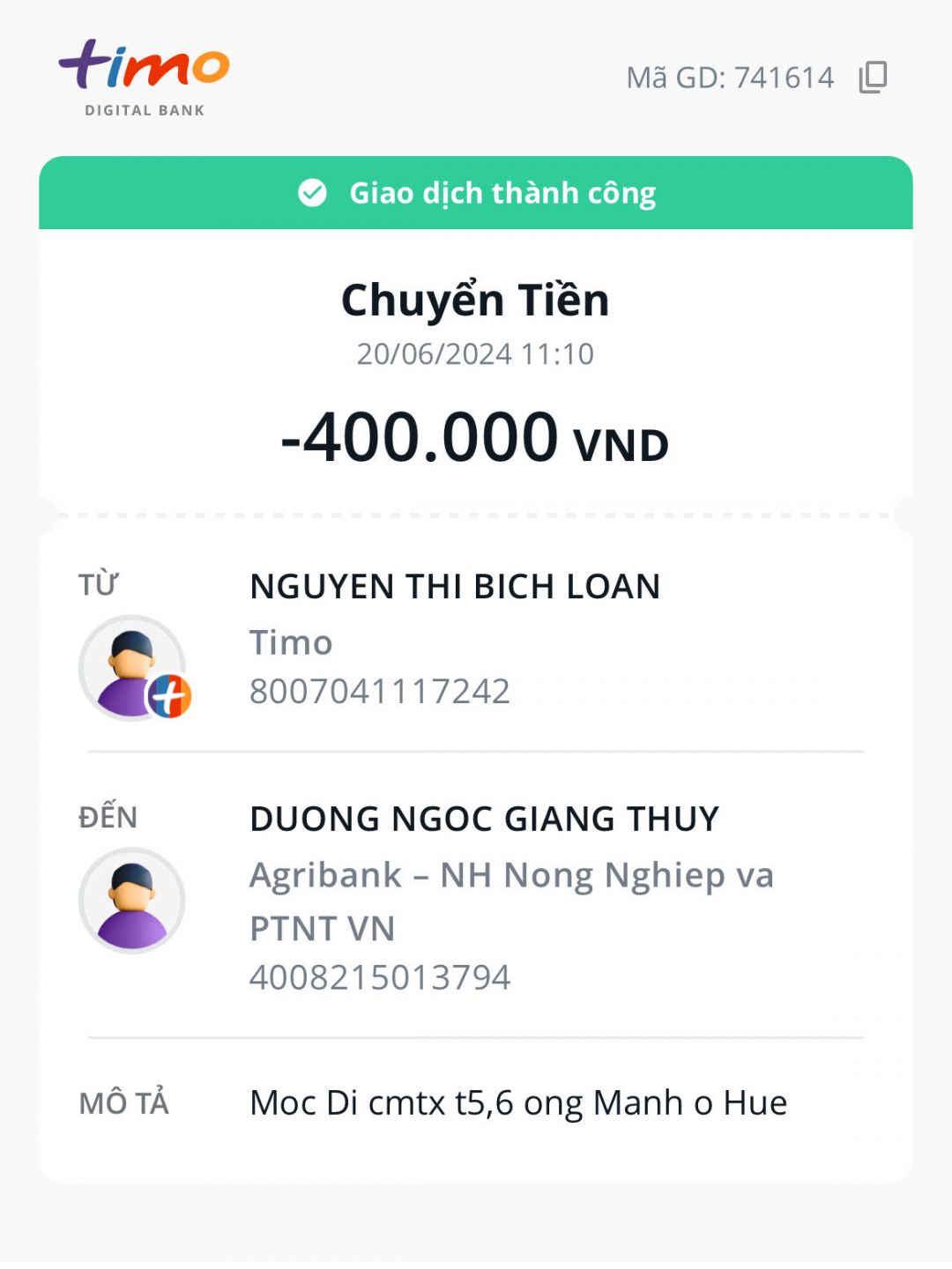 Loannguyen đã chuyển 400,000đ CMTX T5,6 từ Mộc Di cho @Wendy Duong rồi nhé, nhờ chuyển đến Ông Mạnh giùm ạ .