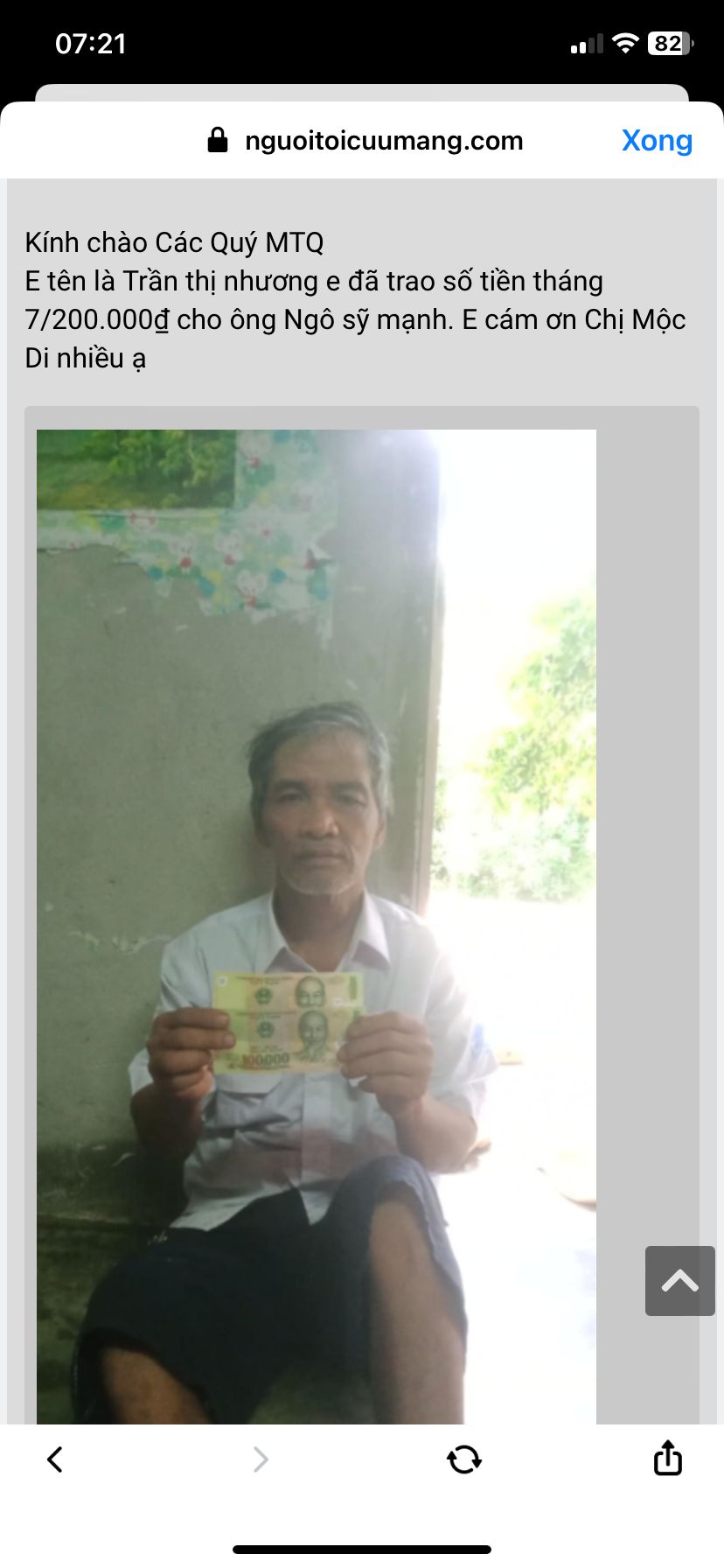 E tên là Trần Thị Nhương. E đã trao số tiền tháng 2/300.000₫ cho ông Ngô sỹ Mạnh. E cám ơn Chị Mộc Di nhiều ạ